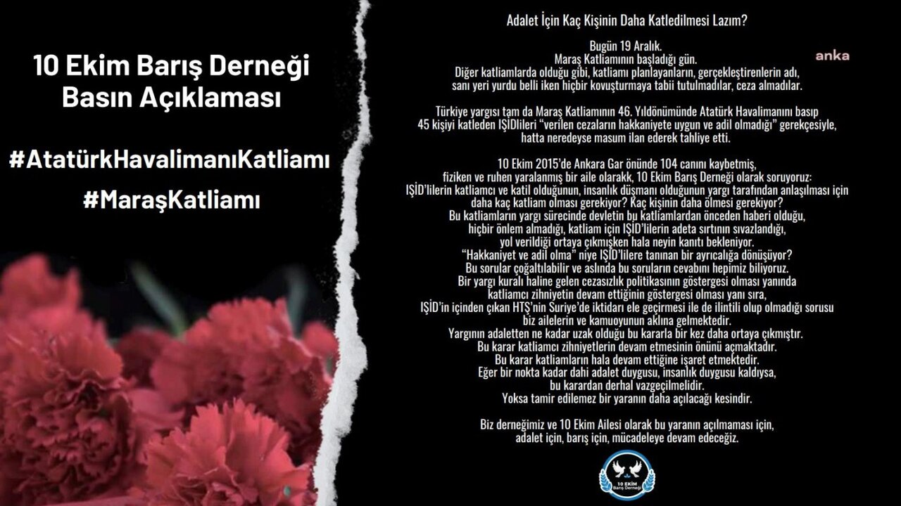 Bugün 19 Aralık. Maraş Katliamının başladığı gün. Diğer katliamlarda olduğu gibi, katliamı planlayanların, gerçekleştirenlerin adı, sanı yeri yurdu belli iken hiçbir kovuşturmaya tabii tutulmadılar, ceza almadılar. Türkiye yargısı tam da Maraş Katliamının 46. yıl dönümünde Atatürk Havalimanını basıp 45 kişiyi katleden IŞİDlileri 'verilen cezaların hakkaniyete uygun ve adil olmadığı' gerekçesiyle, hatta neredeyse masum ilan ederek tahliye etti. 10 Ekim 2015’de Ankara Gar önünde 104 canını kaybetmiş, fiziken ve ruhen yaralanmış bir aile olarak, 10 Ekim Barış Derneği olarak soruyoruz: