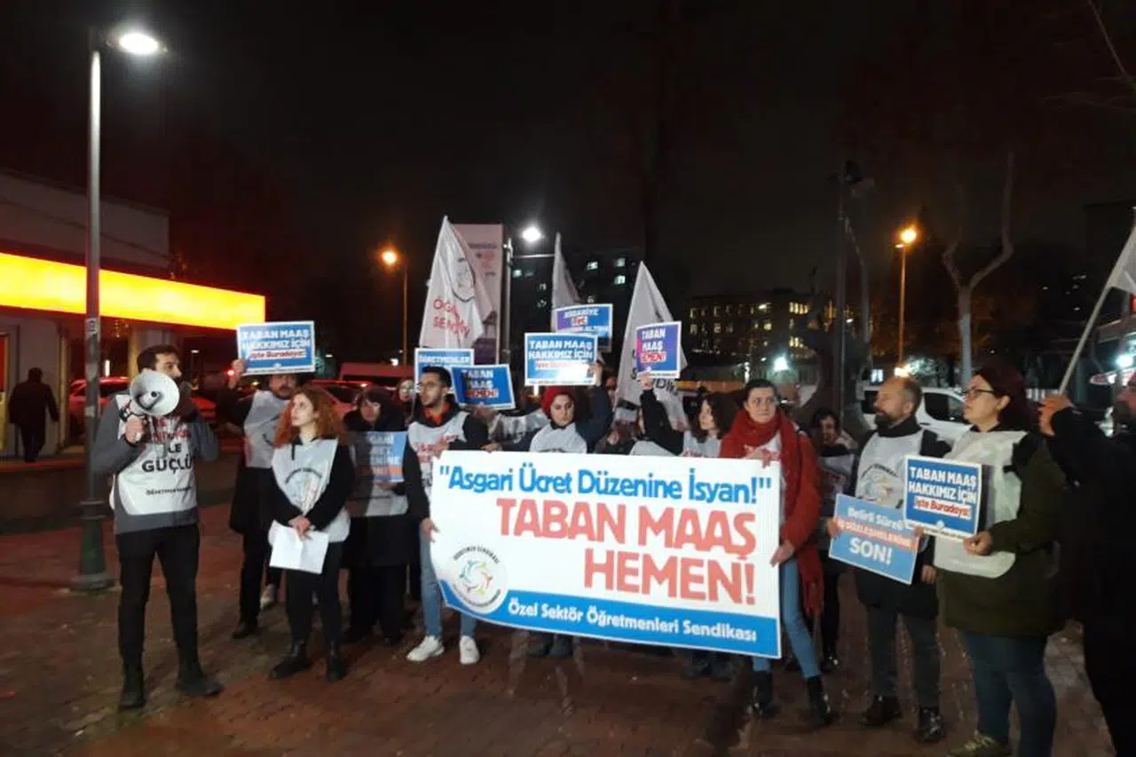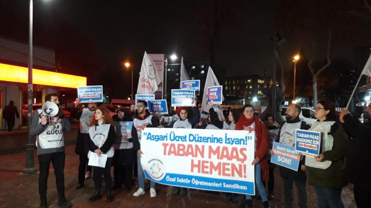 Bu ülkedeki emekçiler; ev kirasını bile karşılayamıyorken faturasıyla, market masraflarıyla, toplu ulaşım gideriyle ve çocuğunun ihtiyaçlarıyla nasıl baş edebilir? Sanayiden tarıma, sağlıktan eğitime kadar, asgari ücrete yani sefalete mahkum edilen milyonlarız. Bizler; özel öğretim kurslarında, özel okullarda, kreşlerde, rehabilitasyon merkezlerinde, vakıf üniversitelerinde ve çeşitli meslek edindirme kurslarında emeği sömürülen öğretmenleriz. Bizler aynı zamanda devlet okullarında güvencesiz ve düşük ücretle çalıştırılan ücretli öğretmenleriz. Özel sektör öğretmenleri bir kıskaca alınmış, emeği ve mesleği değersizleştirilmiştir. Buradan sesleniyoruz: Asgariye hatta onun da altına çalışmaya zorlayan eğitim kurumlarının patronları, bu yanlıştan derhal vazgeçmelidir.