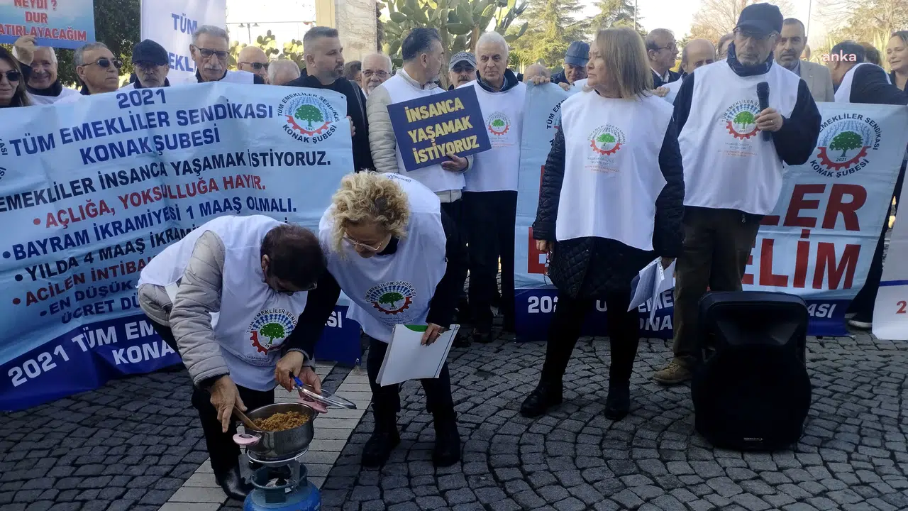 Tüm Emekliler Sendikası, basın açıklamasıyla emekli maaş zamlarına tepki gösterdi. ''Emekliler öldü, Allah rahmet eylesin'' diyen emekliler, kendi helvalarını kavurdu. Emekliler adına açıklamayı ise Tüm Emekliler Sendikası Konak Şube Başkanı Ayşe Ekşioğlu yaptı.