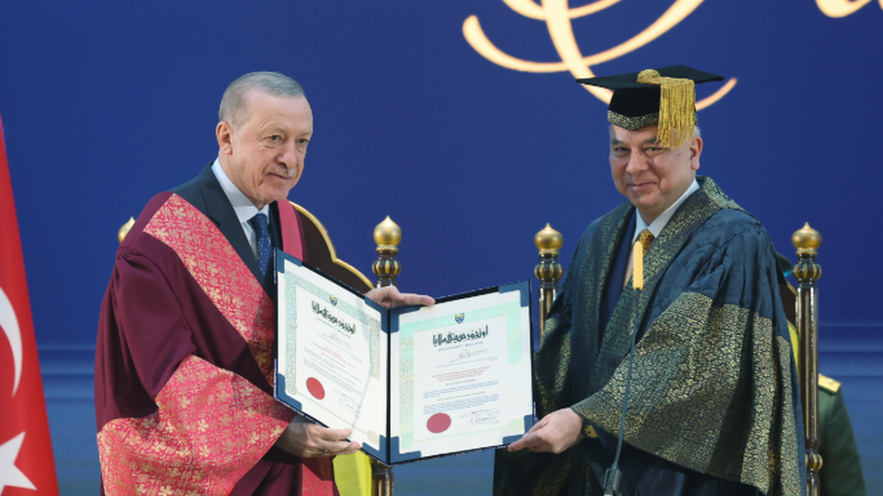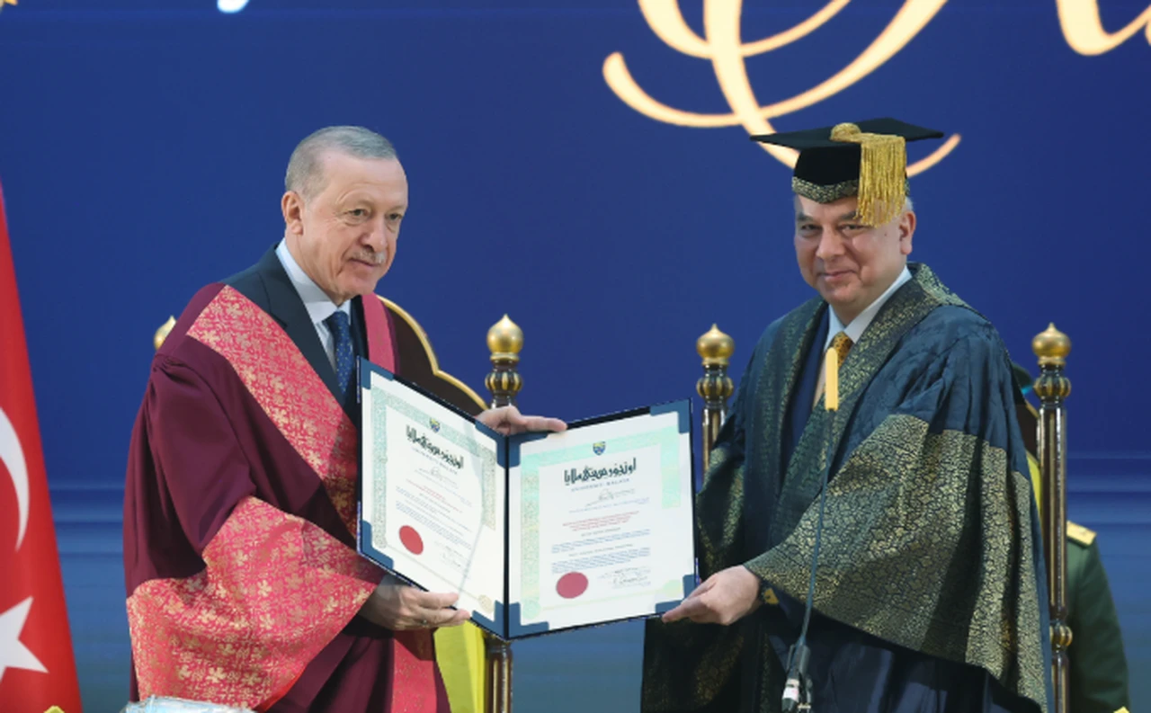 Cumhurbaşkanı Erdoğan, daha sonra Malaya Üniversitesi tarafından uluslararası ilişkiler alanında tevdi edilen ve Perak Sultanı Nazrin Şah tarafından kendisine sunulan fahri doktora beratını almak üzere Putrajaya Uluslararası Kongre Merkezi’nde gerçekleştirilen törene katıldı.