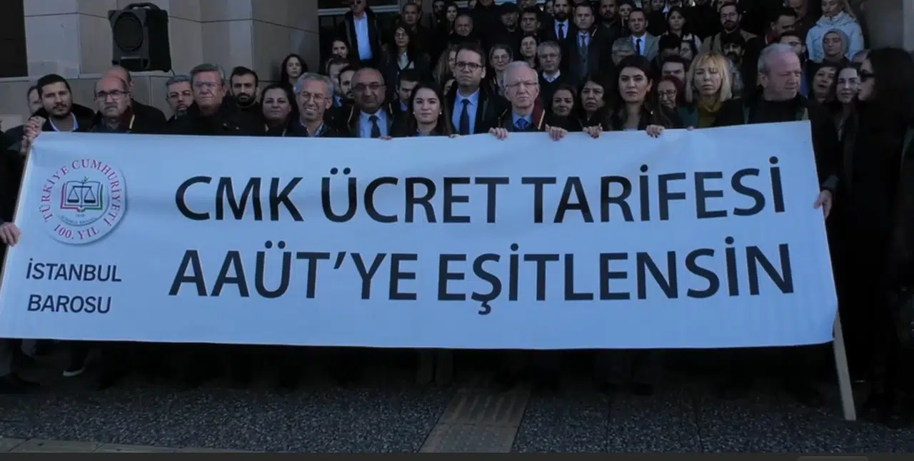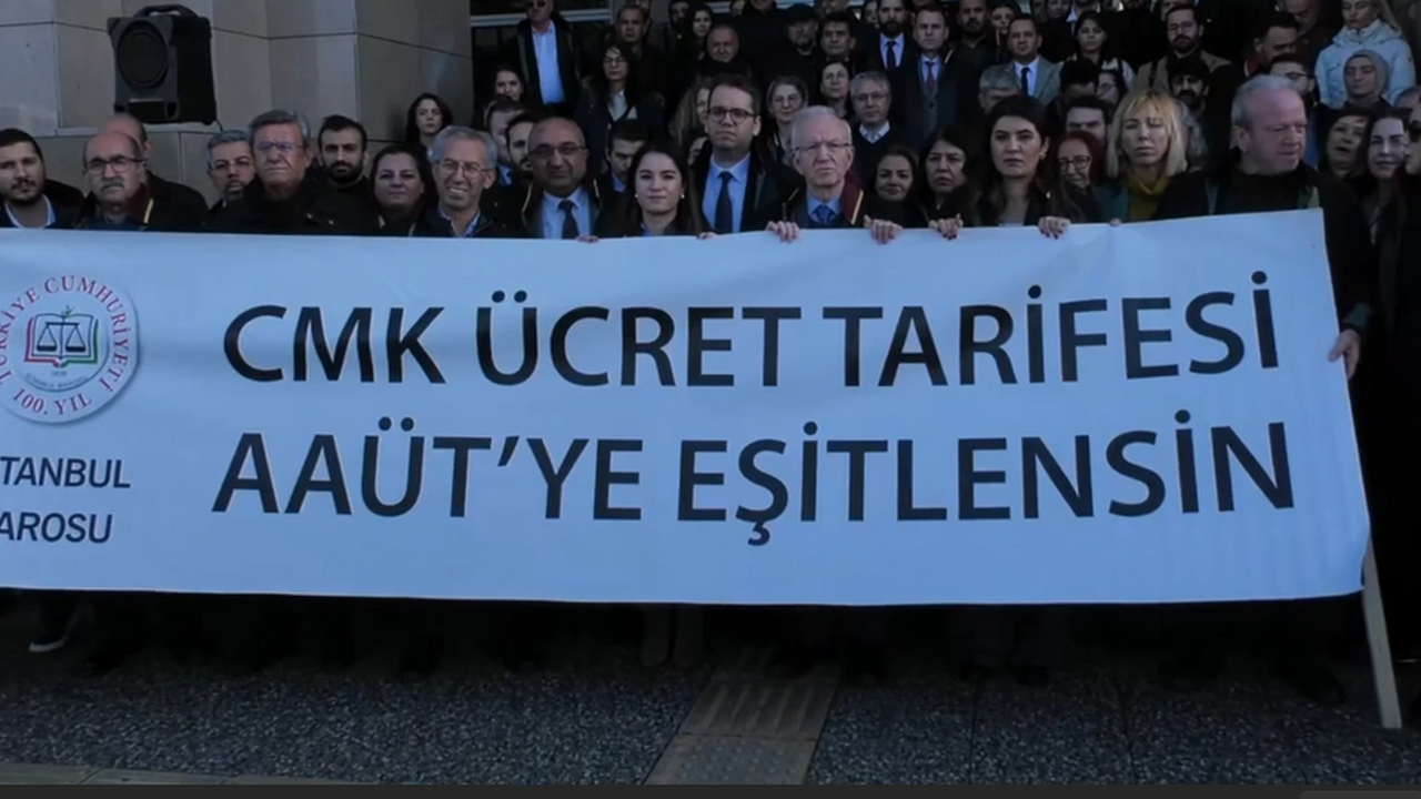 İstanbul Barosu Başkanı İbrahim Kaboğlu, bir grup avukatla beraber İstanbul Adliyesi önünde CMK ücretlerine ilişkin basın açıklaması yapıldı. Basın açıklamasını İstanbul Barosu Yönetim Kurulu Üyesi Ekim Bilal Selimoğlu okudu. Baronun belirlediği CMK ücretinin 48 bin TL olduğuna değinen Selimoğlu şunları söyledi:
