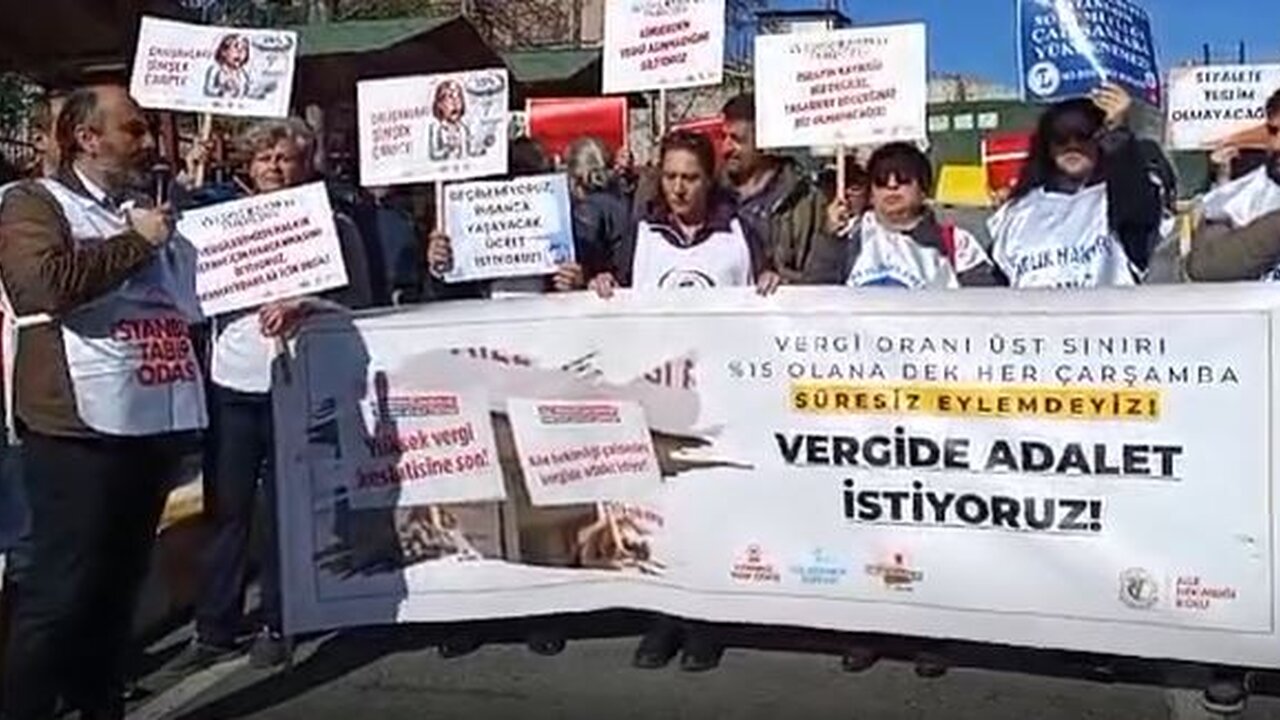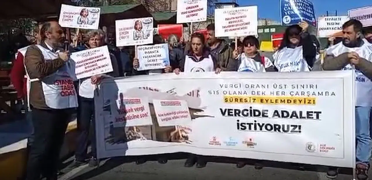 SES ve İTO üyelerinin ‘vergide adalet’ talebiyle başlattıkları eylem sürüyor. Eylemin 45'inci haftasında Çapa'daki İstanbul Tıp Fakültesi Hastanesi önünde bir araya gelen sağlık çalışanları, burada açıklama yaptı. Sağlık çalışanlarının taleplerinin yinelendiği açıklamada, "Bolu’da 36’sı çocuk 78 yurttaşımız tatil yaptıkları otelde yanarak, boğularak, pencerelerden atlayarak yaşamını yitirdi. 78 insanımızın acısını unutturmamak, failleri ortaya çıkarmak, yönetemeyenlerin hesap vermesini istemek için taleplerimizi birleştirdik, ‘topyekun adalet’ demeye başladık" denildi.