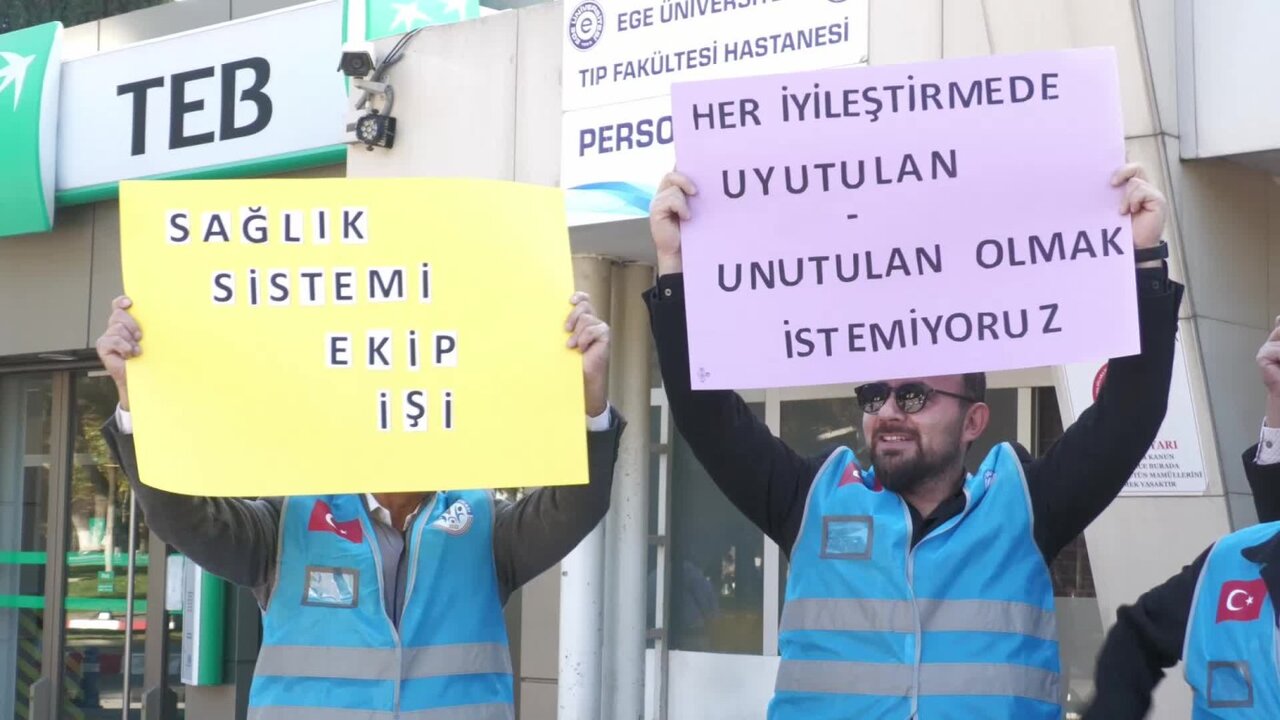 Ege Üniversitesi Tıp Fakültesi Hastanesi'nde çalışan Genç Sağlık Sendikası üyesi sağlık emekçileri yaşadıkları sorunları dile getirdi. Hastane önünde basın açıklamasında bulunan sağlık emekçileri, yıllardır çözülemeyen sorunlarını çözülmesini istedi.