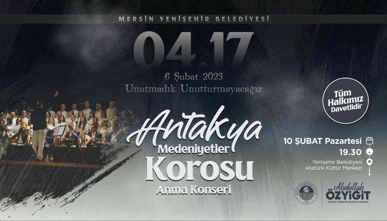 Mersinlileri anma konserine davet eden Yenişehir Belediye Başkanı Abdullah Özyiğit, “6 Şubat depremleri, hepimizin yüreğinde derin izler bıraktı. Bu felakette yitirdiklerimizi, evsiz kalanları ve hayatları değişen tüm vatandaşlarımızı asla unutmayacağız. Antakya Medeniyetler Korosu ile hayatını kaybeden vatandaşlarımızı anmak, acılarımızı paylaşmak ve dayanışma ruhunu daima canlı tutmak adına düzenleyeceğimiz anma konserine vatandaşlarımızı bekliyoruz.” ifadelerini kullandı.