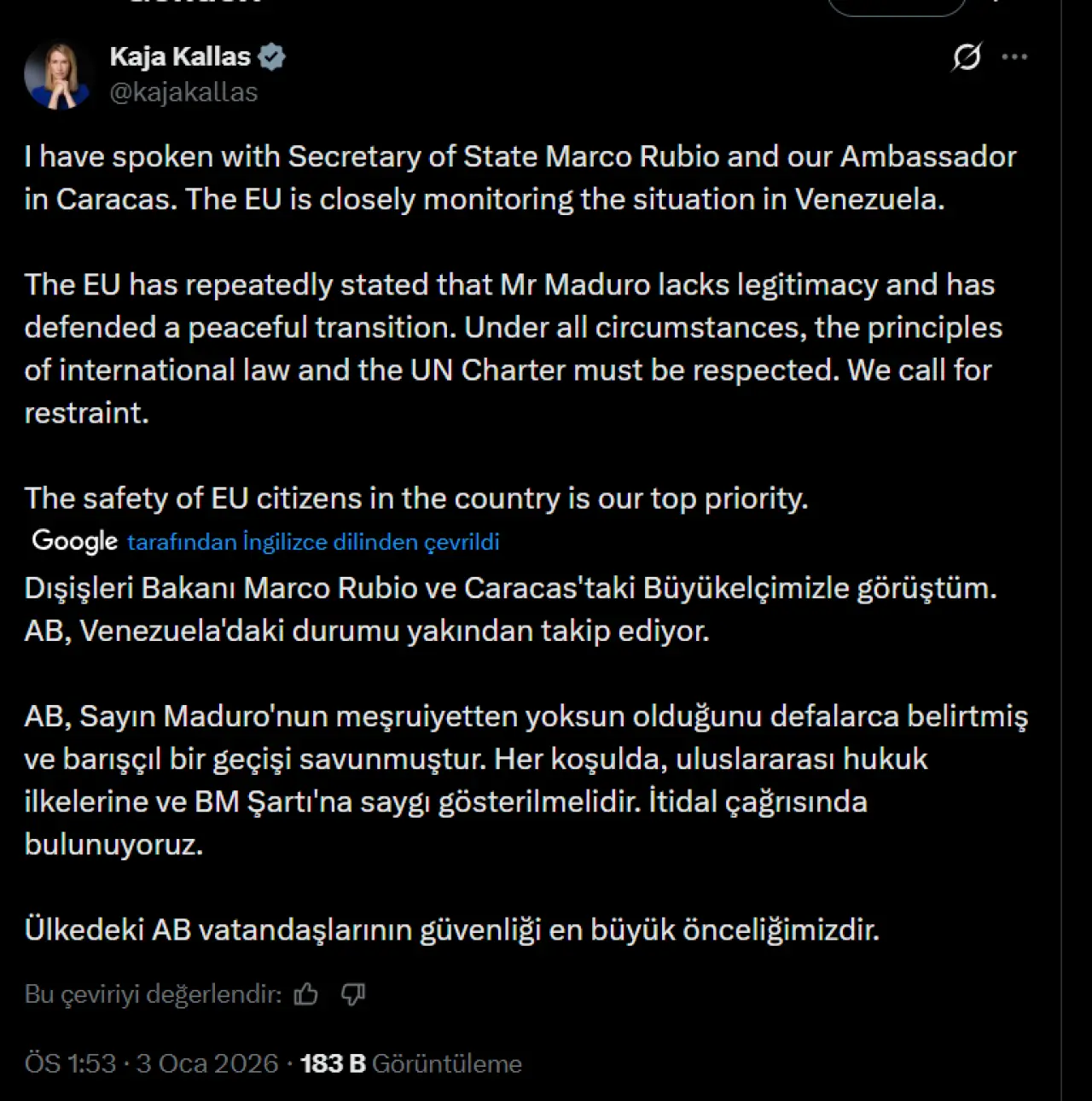 AB Dış İlişkiler ve Güvenlik Politikası Yüksek Temsilcisi ve Avrupa Komisyonu Başkan Yardımcısı Kaja Kallas, sosyal medya hesabından bir açıklama yaparak üstü kapalı olarak ABD'nin Venezuela'ya yaptığı saldırıyı onadı.