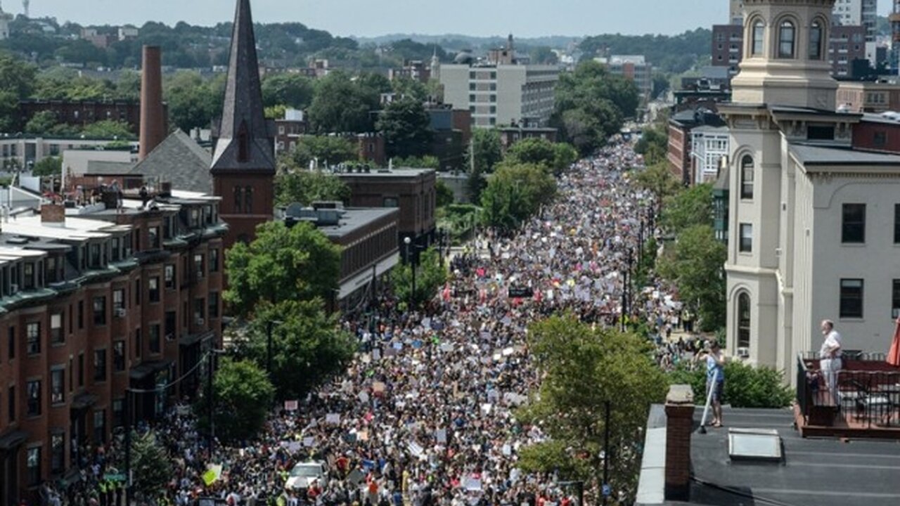 Kent merkezinde toplanan göstericiler ırkçılık ve nefret karşıtı sloganlar atarak benzer mesajlar içeren dövizleri taşıdı.