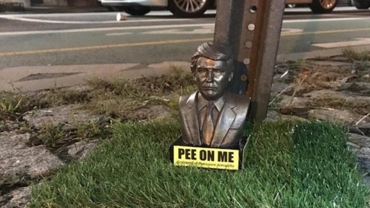New Yorklu reklamcı/sanatçı Phil Gable, şehrin dört bir yanına ‘üstüme işeyin’ yazılı Trump büstleri yerleştirdi.
