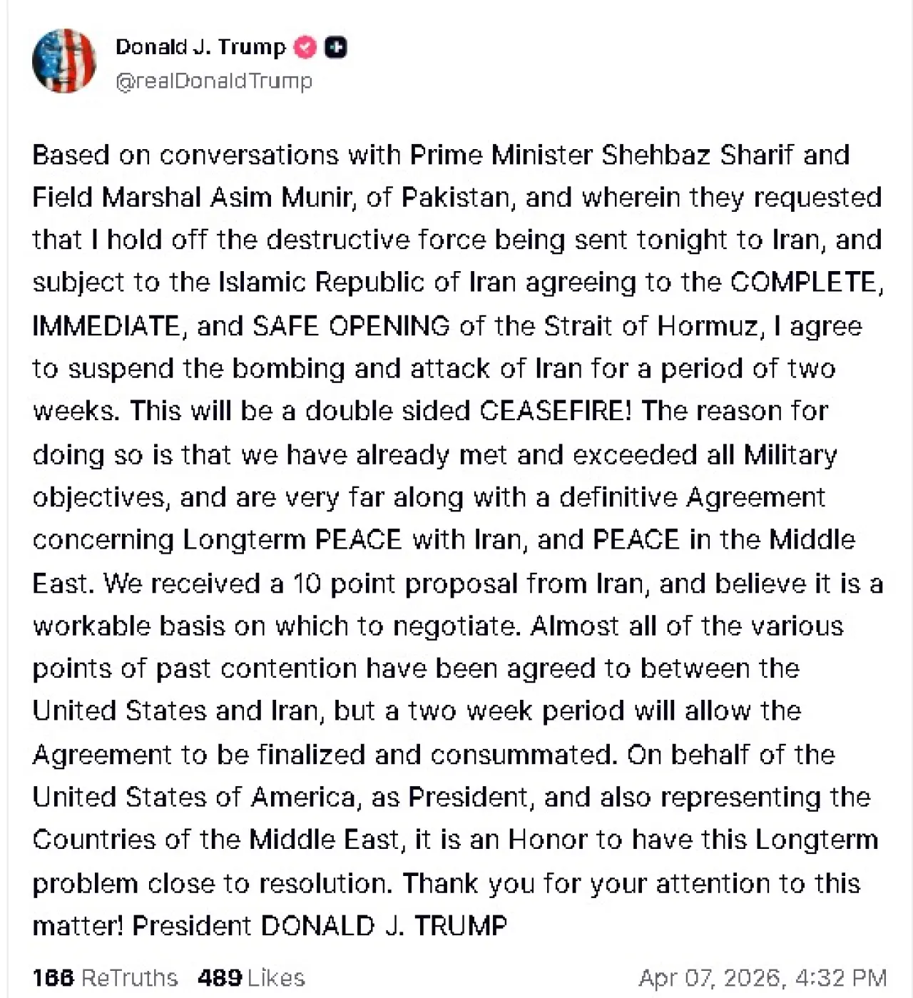 Orta Doğu’da haftalardır yükselen gerilimde dikkat çeken yeni gelişme, Trump’ın görselde yer alan açıklaması oldu. Paylaşımda Trump, Pakistan Başbakanı Şahbaz Şerif ve Pakistan Genelkurmay çevresiyle yapılan temaslara işaret ederek, İran’a yönelik planlanan bombardıman ve saldırıları iki hafta süreyle askıya almayı kabul ettiğini duyurdu. Mesajda, bu sürecin “çift taraflı ateşkes” niteliği taşıyabileceği vurgulanırken, İran’ın Hürmüz Boğazı’nı “tam, derhal ve güvenli” biçimde açmasının temel şart olarak öne çıktığı görüldü.