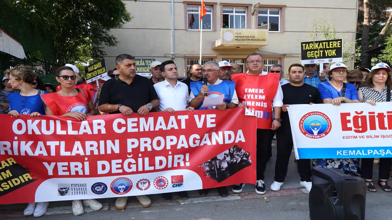 Kemalpaşa Milli Eğitim Müdürlüğü önünde yapılan açıklamada, tarikat ve cemaat yapılanmalarının okullarda giderek artan etkinliği üzerine dikkat çekildi. Okullarda tarikat ve cemaatlere bağlı dernek ve vakıfların denetimsiz faaliyet yürüttüğünü belirten katılımcılar, temizlik görevlilerinden bile detaylı araştırma istenirken, bu yapıların kurs veren kişileri hakkında hiçbir kontrolün yapılmadığını kaydetti.