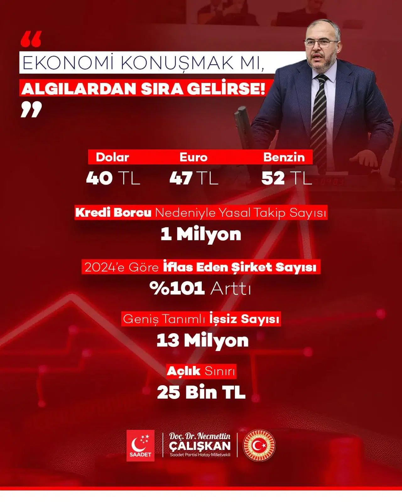 Saadet Partisi Hatay Milletvekili Doç. Dr. Necmettin Çalışkan, sosyal medya aracılığıyla Türkiye'nin ekonomik durumuna dair çarpıcı analizler sundu. Paylaşımında, halkın giderek artan geçim sıkıntılarına dikkat çekerek vatandaşların artık hayatta kalma mücadelesi verdiğini dile getirdi. Çalışkan, gençlerin iş bulmaktan ziyade borç peşinde koştuklarını belirtti. Bu durumun toplumun geniş bir kesimini etkilediğini vurgulayan Çalışkan, güncel ekonomik verileri paylaşarak daha derin bir analizde bulundu.