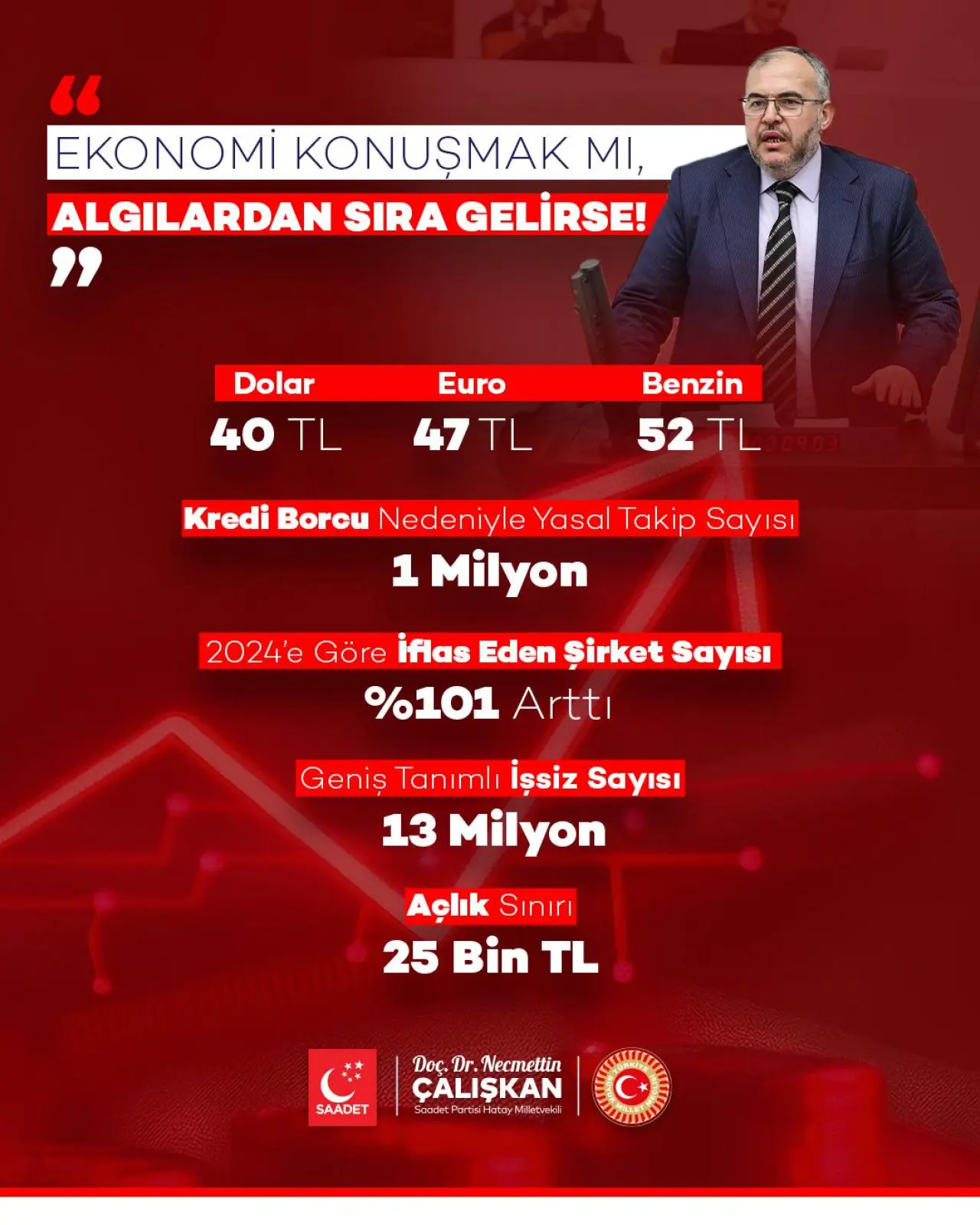 Çalışkan, Türkiye’nin içinde bulunduğu ekonomik krizin boyutlarını güncel verilerle ortaya koydu. Doların 40 TL, Euro’nun ise 47 TL seviyesine yükselmesi, benzin fiyatlarının da 52 TL'yi bulması, vatandaşı derinden etkiledi. Bu yükselişler halkın alım gücünü ciddi şekilde azalttı ve geçim sıkıntılarını artırdı. Kredi borcunu ödeyemeyenlerin sayısının bir milyonu geçtiği belirtiliyor. Bu durum, birçok ailenin bütçesinin zorlandığını ve ekonomik olarak kötü bir duruma düştüğünü gösteriyor. Ayrıca, konkordato başvurularında gözle görülür bir artışın yaşandığı ve bunun işsizlikle birlikte geçim kaygısını daha da büyüttüğü ifade ediliyor.