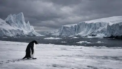 Minimal ve çarpıcı: Tek özne (penguen) + geniş boşluk hissi, ekranda güçlü duruyor.