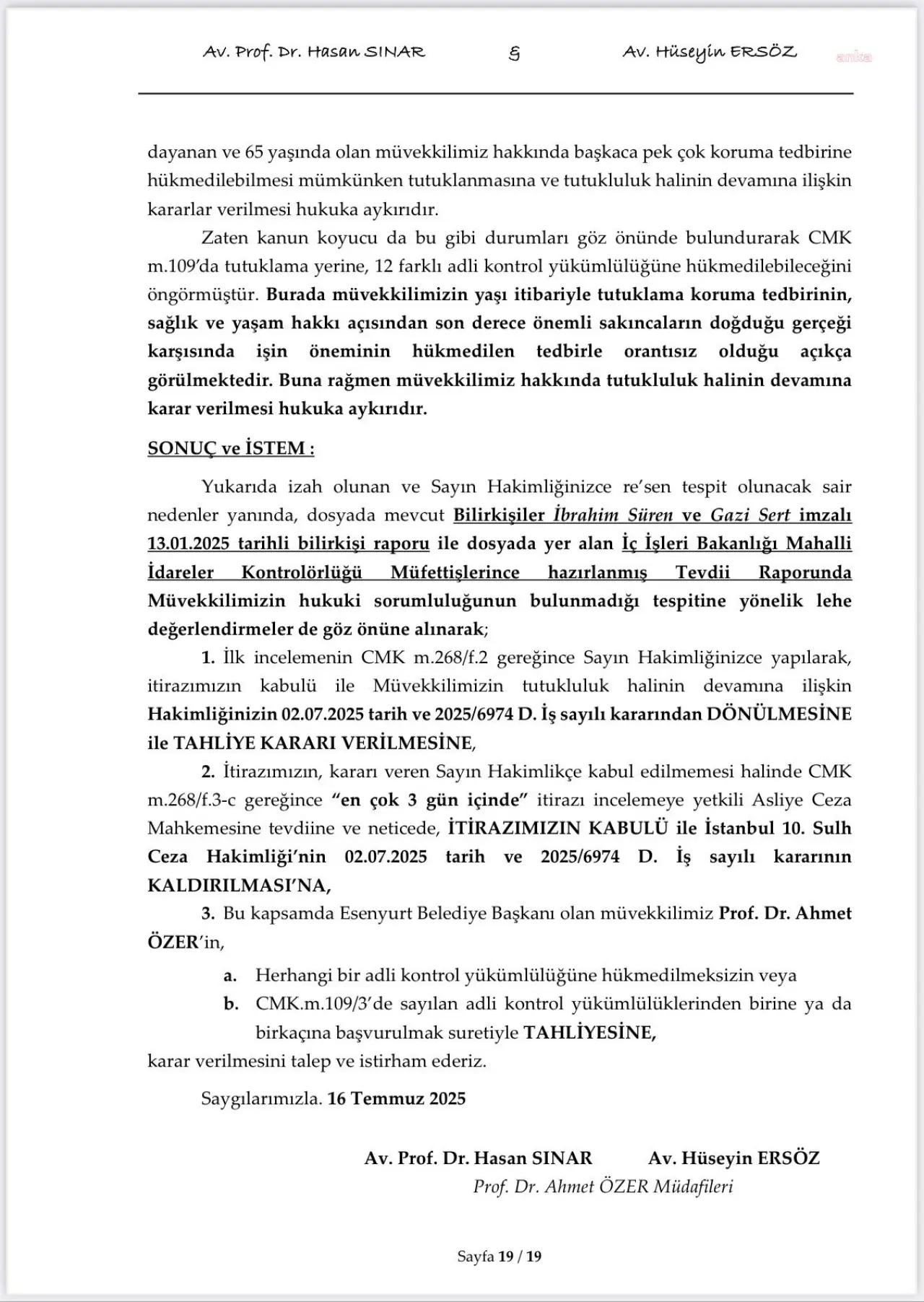 Avukatlar Prof. Dr. Hasan Sınar ve Hüseyin Ersöz imzasıyla bugün sunulan dilekçede, Özer'in suça fiilen ya da hukuken bir katkısının bulunmadığının İçişleri Bakanlığı Mahalli İdareler Kontrolörlüğü ile iki bağımsız bilirkişi tarafından hazırlanmış raporlarla ortaya konulduğu belirtildi. Dilekçede, 13 Ocak 2025 tarihli bilirkişi raporu ile mevcut dosyada yer alan delillerin, Ahmet Özer’in hukuki sorumluluğunu doğurmadığı ifade edildi.