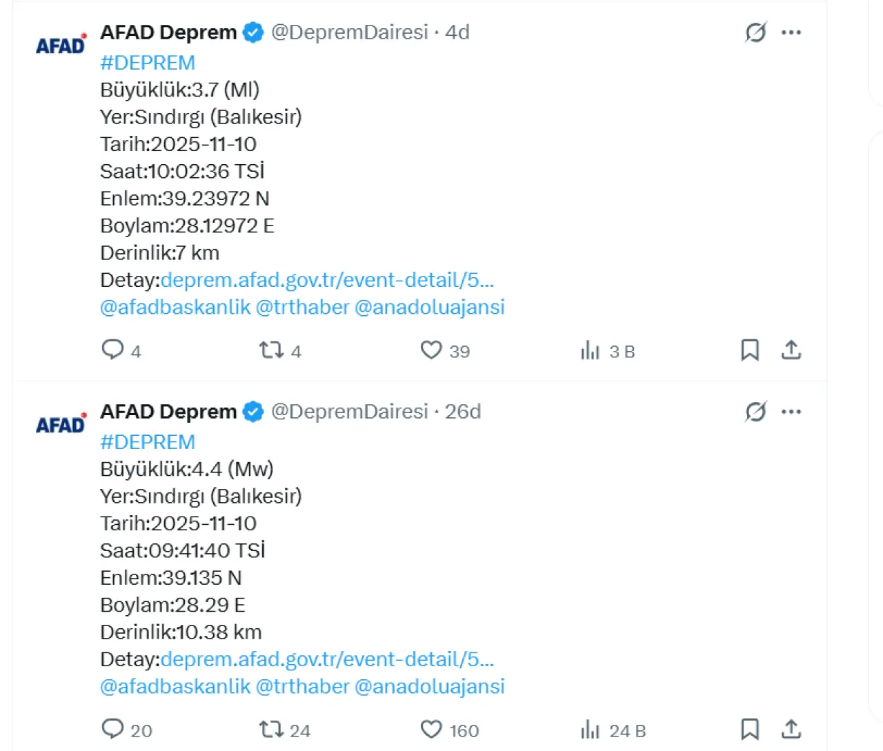 Afet ve Acil Durum Yönetimi Başkanlığı’ndan (AFAD) yapılan açıklamada, saat 09.41’da Balıkesir'in Sındırgı ilçesinde 4.4 büyüklüğünde deprem meydana geldiği bildirildi. Depremin, yerin 7 kilometre derinliğinde oluştuğu belirtildi.