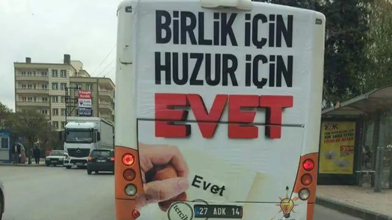 Odatv’de yer alan habere göre, belediyenin toplu taşıma araçlarına astığı işte o “Evet” afişleri;
