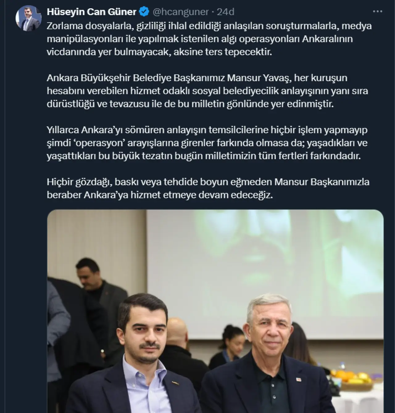 Başkan Hüseyin Can Güner, sosyal medya hesabından yaptığı paylaşımda “Ankara Büyükşehir Belediye Başkanımız Mansur Yavaş, her kuruşun hesabını verebilen hizmet odaklı sosyal belediyecilik anlayışının yanı sıra dürüstlüğü ve tevazusu ile de bu milletin gönlünde yer edinmiştir.” dedi.