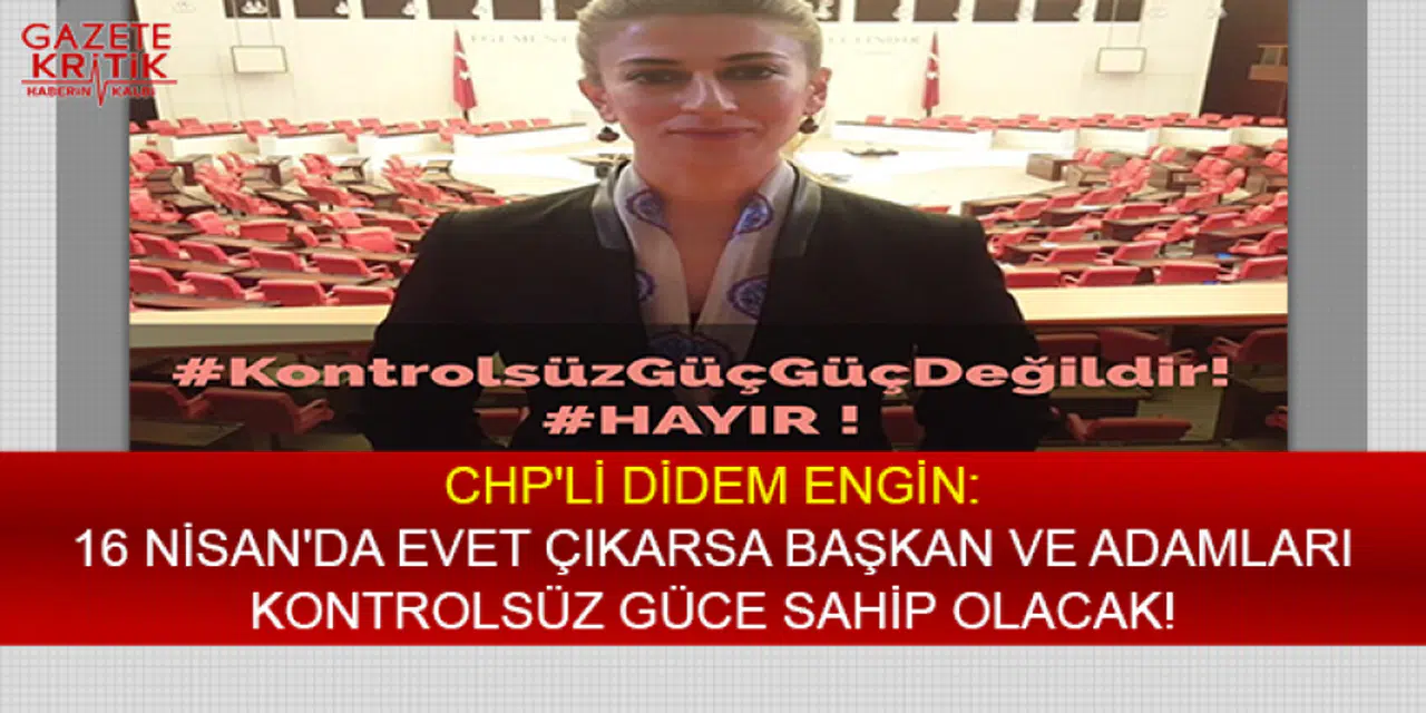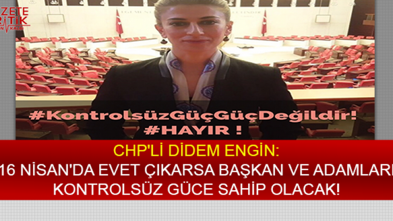 16 Nisan Anayasa Değişikliği Referandumu'na günler kala sosyal medya hesabından 4. videoyu paylaşan CHP İstanbul Milletvekili Didem ENGİN, referandumdan “evet” çıkarsa Meclis'in işlevselliği yitireceğini söyleyerek "Başkan ve adamlarının kontrolsüz bir güce sahip olması her an sonu belirsiz bir kaosa yol açabilir" dedi.