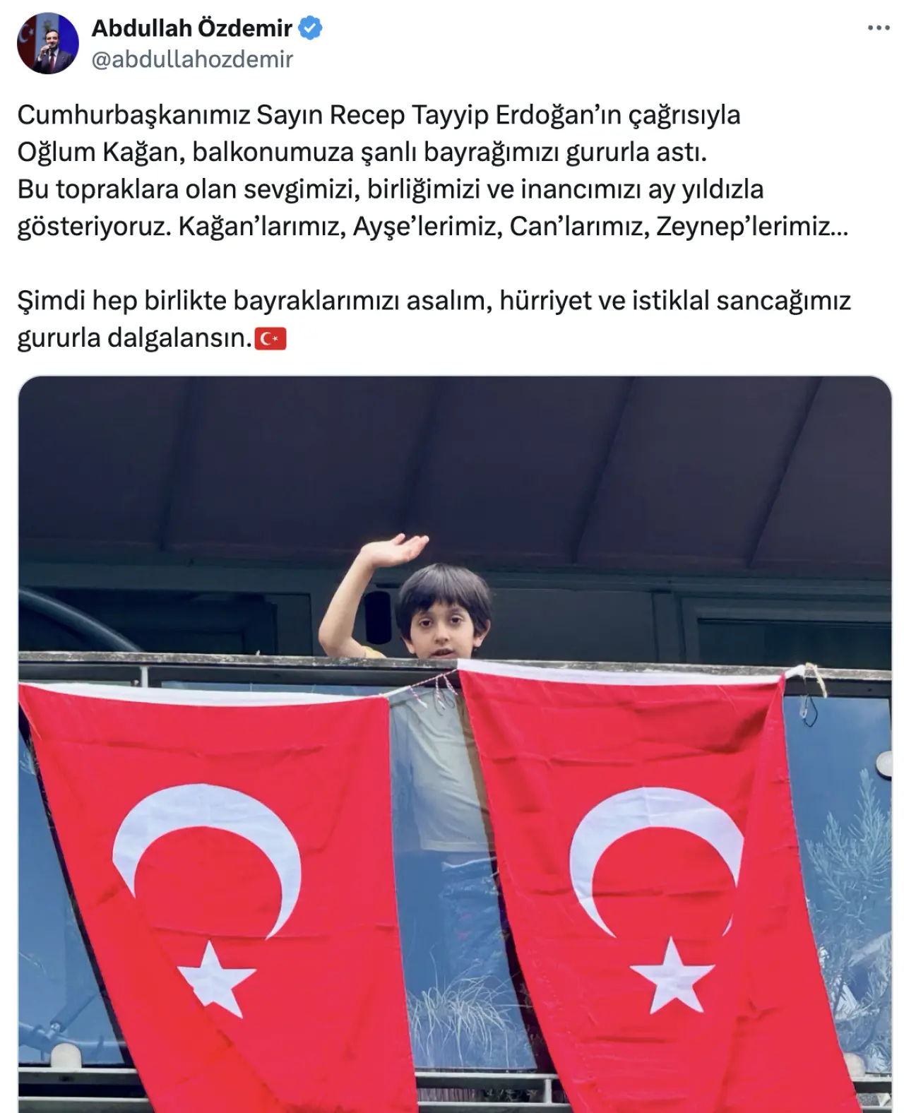 AK Parti İstanbul İl Başkanı Abdullah Özdemir, Cumhurbaşkanı Erdoğan’ın çağrısına kayıtsız kalmadı. Oğlu Kağan ile birlikte evlerinin balkonuna Türk bayrağını astığı anı sosyal medya üzerinden paylaştı. Özdemir, paylaşımında Cumhurbaşkanının mesajını hatırlatarak, bayrağın getirdiği ulusal onuru ve bağımsızlığı simgelediğini vurguladı. Özdemir, “Cumhurbaşkanımız Sayın Recep Tayyip Erdoğan’ın çağrısıyla Oğlum Kağan, balkonumuza şanlı bayrağımızı gururla astı,” ifadelerini kullanarak duygularını izleyicileriyle paylaştı.