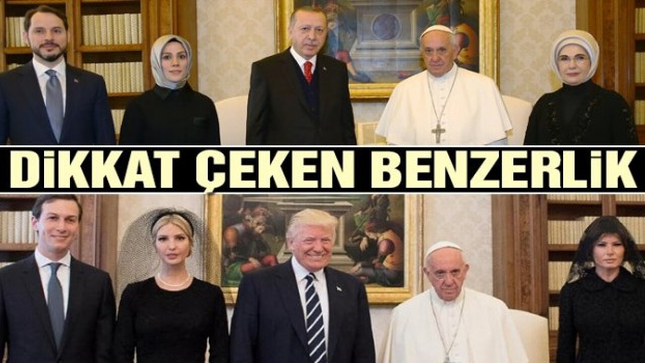 Cumhurbaşkanı Tayyip Erdoğan ve ailesinin Vatikan’da verdiği aile fotoğrafının, ABD Başkanı Donald Trump’ın 24 Mayıs 2017’deki ziyaretinde çektirdiği fotoğrafla benzerliği dikkat çekti. O karede de Trump’ın yanında eşi Melania, damadı Jared Kushner ve kızı Ivanka bulunuyordu.