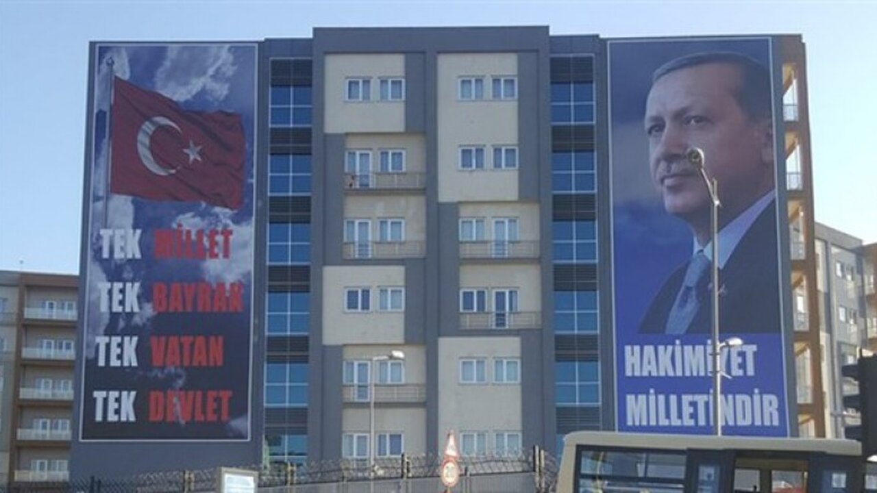 Kamu binaları: İstanbul Cevizlibağ’daki Basın Yayın Enformasyon Genel Müdürlüğünce kullanılan binaya, bütün bir cepheyi kaplayan Erdoğan’lı pankart asıldı.
