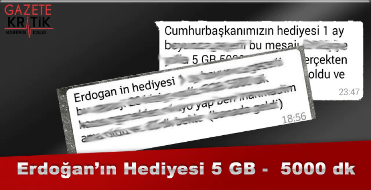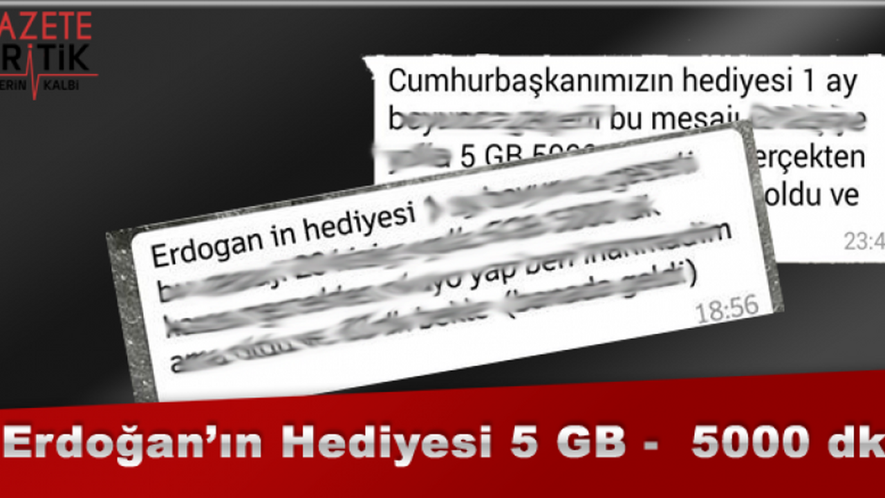 “Erdoğanın hediyesi. 1 ay boyunca geçerli. 20 kişiye gönder, 1000 dakika 1000 SMS 5 GB internet kazan. Ben inanmadım denedim ve oldu.” şeklindeki mesajlar kesinlikle doğruyu yansıtmamaktır. Lütfen bu gibi mesajlara dikkat edelim, azıcık mantıklı davranalım.