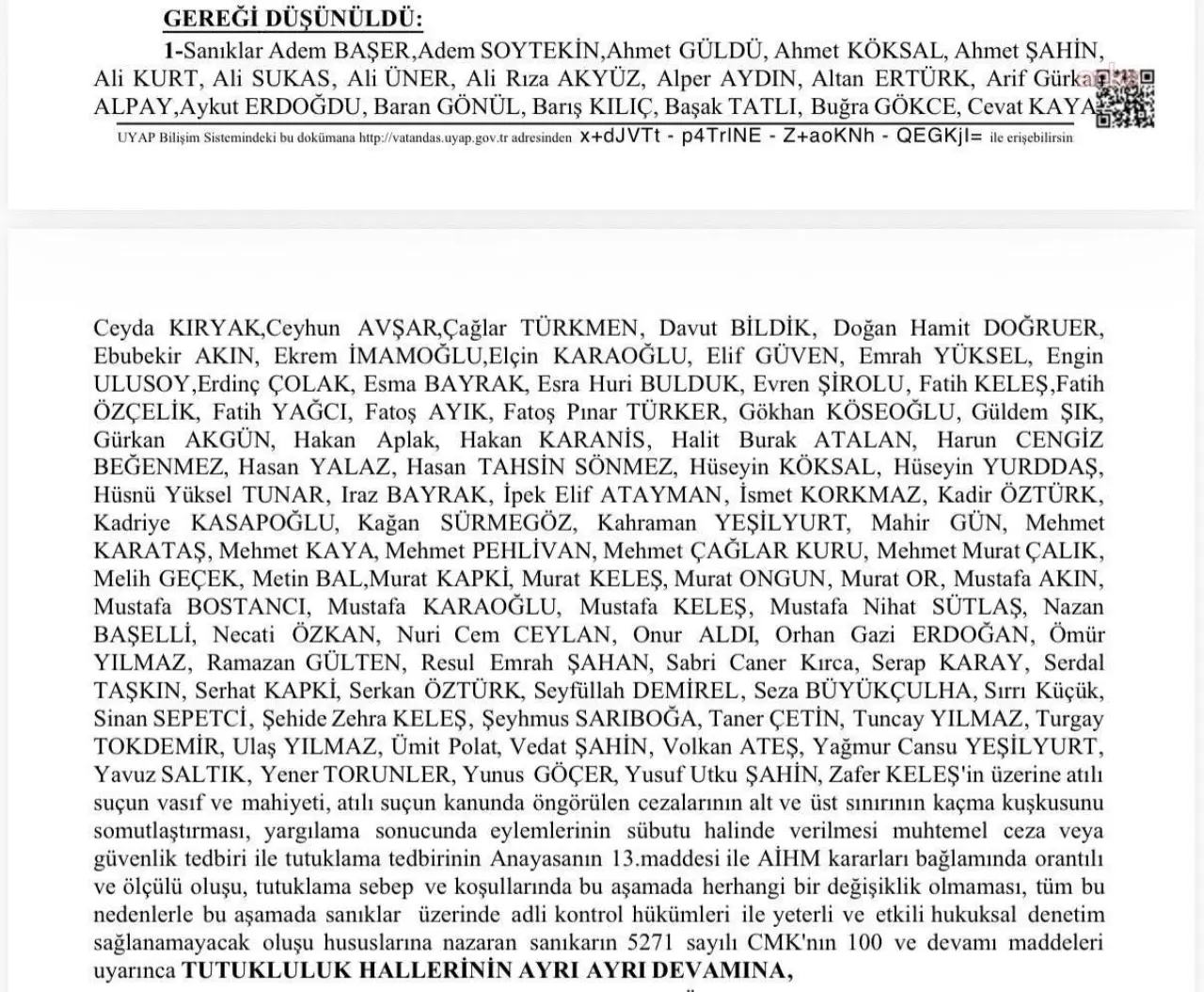 "Dosyada tutuklu 106 kişi hakkında hiçbir öznel değerlendirme yapılmaksızın, genel ve kalıp gerekçelerle tutukluluk halinin devamına karar verildi. Oysa ki dosya kapsamında yargılananlar hakkında farklı suç isnatları ve bu isnatlara ilişkin farklı ceza talepleri var. Bazı isimlere yalnızca bir suç isnadı yöneltilmiş durumda ve ceza verilse dahi kapalı cezaevinde infaz edilecek bir cezaları bulunmuyor. İddianamede bazı isimler örgüt üyeliği ile suçlanıyorken bazılarında bu suç isnadı da yok."
