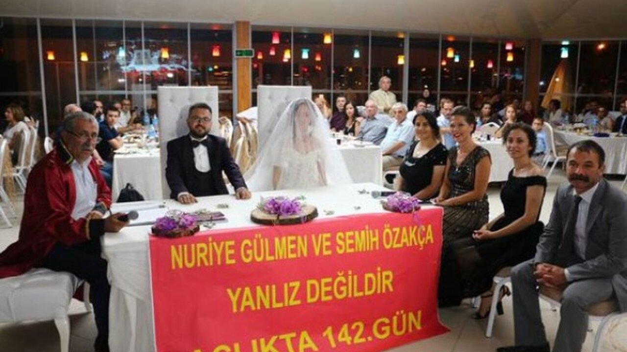 Evrensel'in haberine göre, İstanbul’da Halkın Hukuk Bürosu’nda avukatlık yapan Duygu Ön ve Ahmet Mandacı, Çanakkale’de düzenlenen nikah töreni ile evlendi. Çift bu mutlu günlerinde, KHK ile ihraç edilen ve işlerine geri dönmek için açlık grevine başlayan akademisyen Nuriye Gülmen ve öğretmen Semih Özakça’yı da unutmadı. Gülmen ve Özakça için pankart açan çift, düğüne gelen konuklarca uzun süre alkışlandı.