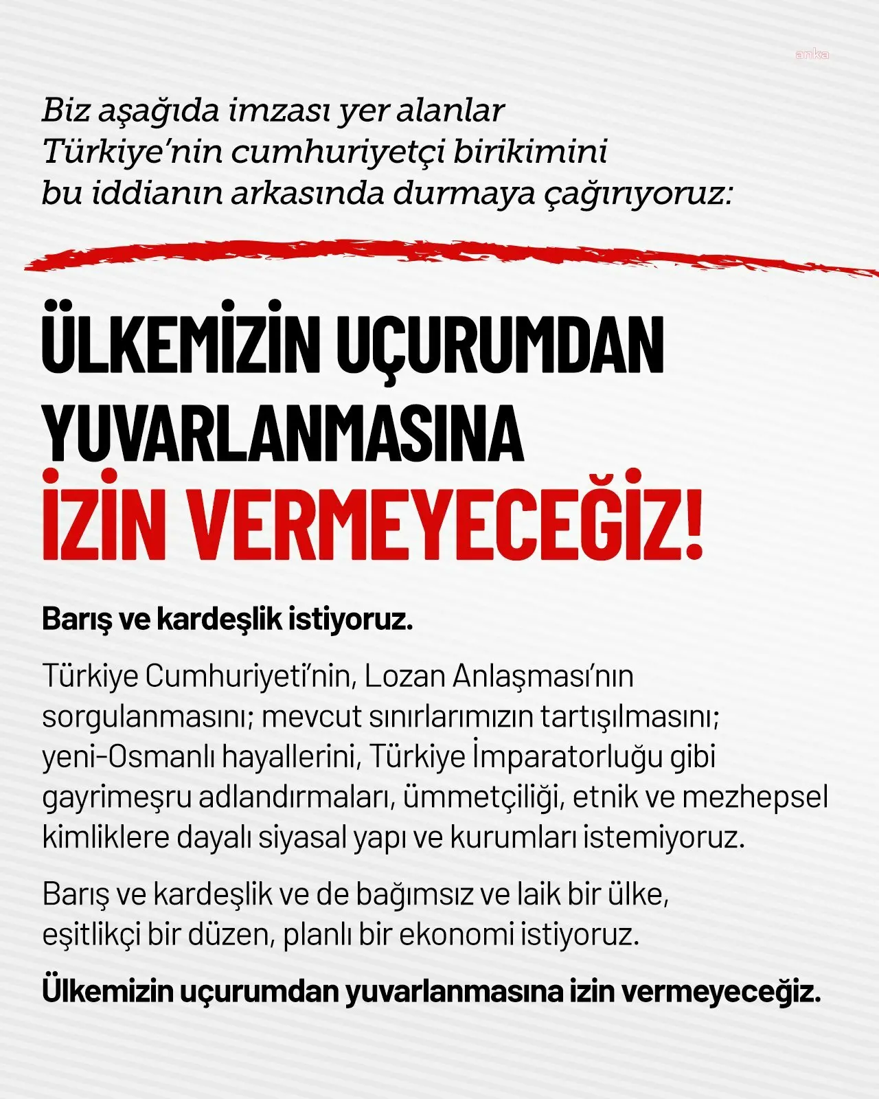 "Biz aşağıda imzası yer alanlar Türkiye’nin cumhuriyetçi birikimini bu iddianın arkasında durmaya çağırıyoruz: Ülkemizin uçurumdan yuvarlanmasına izin vermeyeceğiz. Barış ve kardeşlik istiyoruz. Türkiye Cumhuriyeti’nin, Lozan Anlaşması’nın sorgulanmasını, mevcut sınırlarımızın tartışılmasını, yeni-Osmanlı hayallerini, Türkiye İmparatorluğu gibi gayrimeşru adlandırmaları, ümmetçiliği, etnik ve mezhepsel kimliklere dayalı siyasal yapı ve kurumları istemiyoruz. Barış ve kardeşlik ve de bağımsız ve laik bir ülke, eşitlikçi bir düzen, planlı bir ekonomi istiyoruz. Ülkemizin uçurumdan yuvarlanmasına izin vermeyeceğiz."