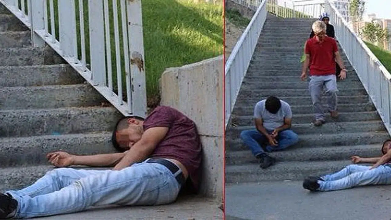 Uyuşturucu madde kullanan ve yarı baygın şekilde merdivenlerde oturanlardan biri uyuşturucunun etkisi azalınca ayağa kalktı. Kameraların kendilerini görüntülediğini fark eden genç, baygın şekilde merdivenlerde yatan arkadaşını tanımadığını söyledi. Bağımlı genç "Arkadaşım değil. Ben sadece başında oturdum yazık günah dedim. Merdivenlerin ortasında oturuyordu onu oraya ben çektim. Sanki bayılmış o ya, sanki bonzai içmiş. Ben kullanmıyorum, benim işim olmaz” diye konuştu.