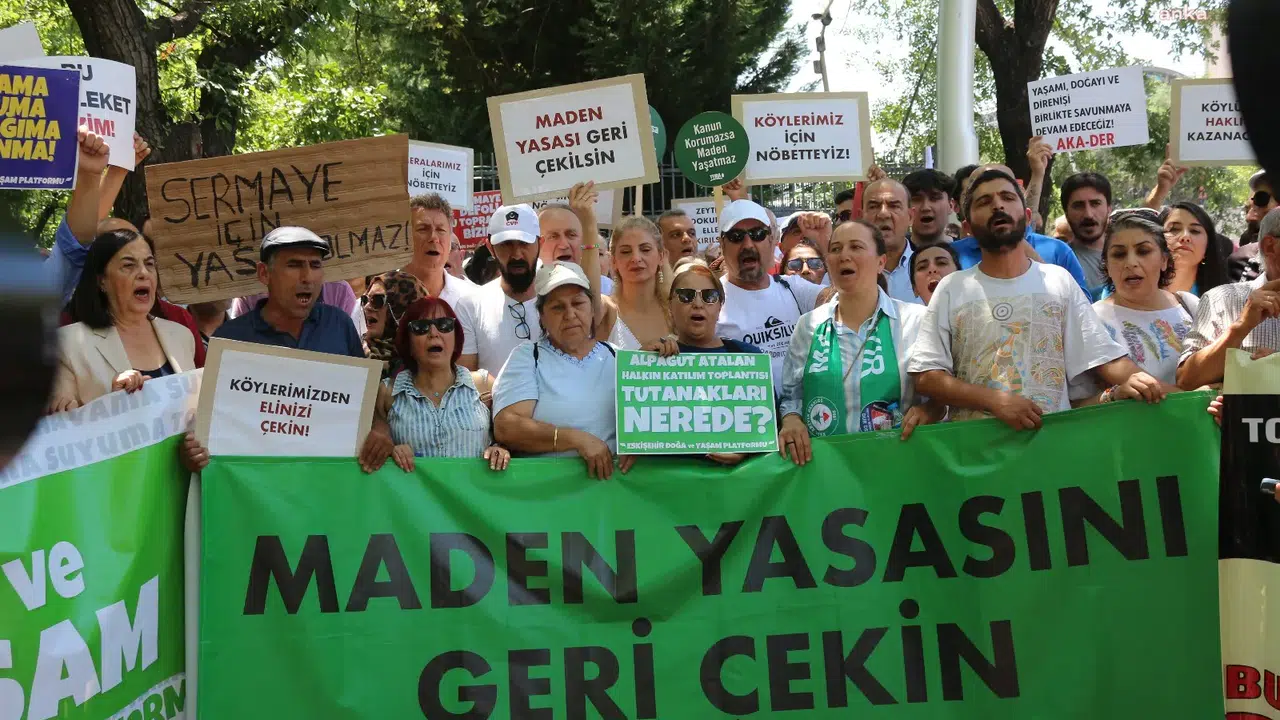 Zeytinliklerin madencilik faaliyetine açılmasını öngören Maden Yasası'na karşı köylüler, Ankara’da Cemal Süreya Parkı’nda 13 gündür eylemlerini sürdürüyor. Türkiye Barolar Birliği'nin çağrısı ile Ankara'ya gelen avukatlar Maden Yasası'na ilişkin Cemal Süreya Parkı'nda açıklama yaptı. Açıklamayı, Türkiye Barolar Birliği Kent ve Çevre Hukuku Komisyonu Sözcüsü Nur Hilal Gündüz okudu.