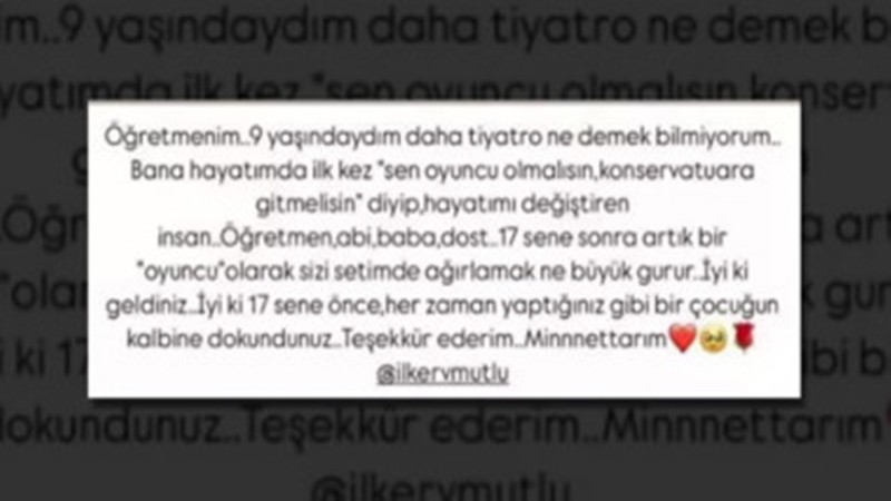 Ünlü oyuncu, öğretmeniyle çektirdiği bir fotoğrafı sosyal medya hesabından takipçilerinin beğenisine sunarak, "Öğretmenim... 9 yaşındaydım daha tiyatro ne demek bilmiyorum. Bana hayatımda ilk kez 'Sen oyuncu olmalısın, konservatuvara gitmelisin' diyerek, hayatımı değiştiren insan... Öğretmen, ağabey, baba, dost... 17 sene sonra artık bir 'oyuncu' olarak sizi setimde ağırlamak ne büyük gurur. İyi ki geldiniz. İyi ki 17 sene önce her zaman yaptığınız gibi bir çocuğun kalbine dokundunuz. Teşekkür ederim. Minnettarım" ifadelerini kullandı.