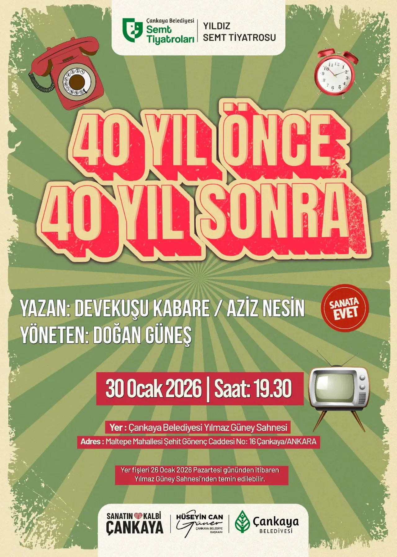 Çankaya Belediyesi Yıldız Semt Tiyatrosu ise "40 Yıl Önce 40 Yıl Sonra" oyunu ile tiyatro severlerle buluşacak. Devekuşu Kabare ile Aziz Nesin ortaklığında yazılan ve yönetmen koltuğunda Doğan Güneş'in oturduğu oyun, 30 Ocak tarihinde Yılmaz Güney Sahnesi'nde sahnelenecek. Yer fişleri 26 Ocak 2026 Pazartesi gününden itibaren Yılmaz Güney Sahnesi’nden temin edilebilecek.