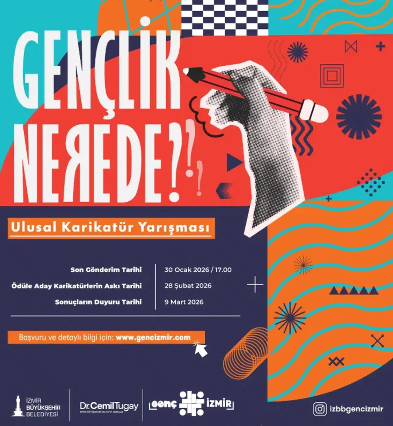 İzmir Büyükşehir Belediyesi, gençlerin sesini sanatın gücüyle duyurmak amacıyla “Gençlik Nerede?” temalı Ulusal Karikatür Yarışması düzenliyor. Gençliğin bugünü ve yarınına dair umutlarına ışık tutacak yarışmada dereceye girenlere toplamda 130 bin TL ödül dağıtılacak.
