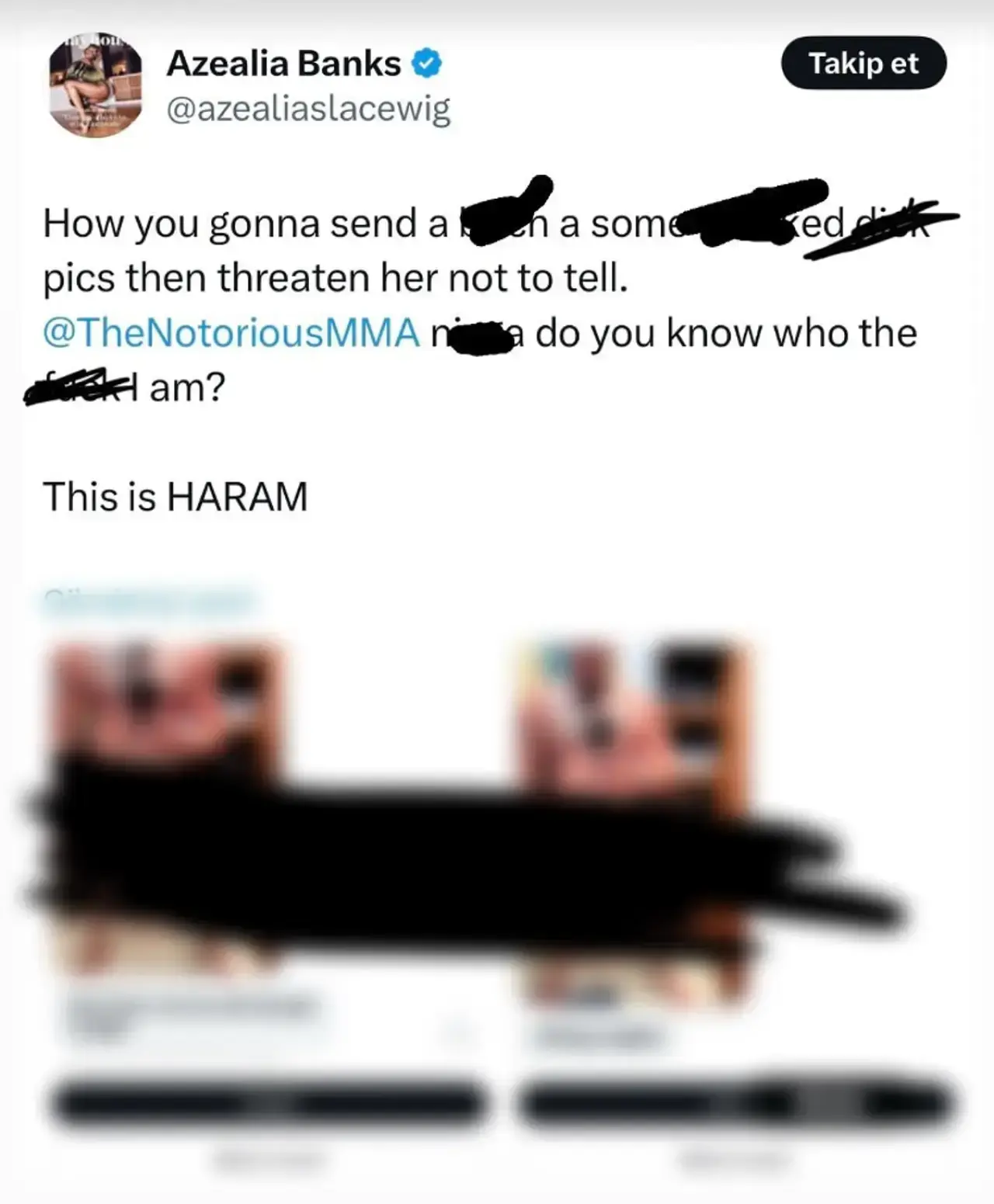 14 Temmuz 2025’te sosyal medyada patlak veren olayda Azealia Banks, McGregor’un kendisine izinsiz ve istenmeyen çıplak fotoğraflar gönderdiğini iddia etti. Banks, bu iddiasını McGregor’a ait olduğu ileri sürülen özel fotoğraflar ve mesajlarla kanıtlayarak “Bu tacizdir!” diyerek büyük bir tepki topladı. Rapçi, “Bu haram! Üstelik bu adam İrlanda cumhurbaşkanı mı olacak? Hangi ülkede bu normal karşılanır?” ifadelerini kullandı.