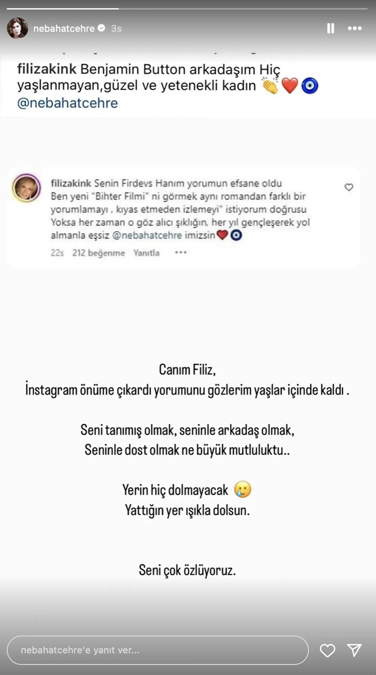 Can dostu Filiz Akın’ın vefat haberinden sonra büyük acı yaşayan Nebahat Çehre, sosyal medya hesabından yaptığı duygusal paylaşımda, Instagram’ın eski mesajlarını karşısına çıkarınca gözyaşlarını tutamadı. Usta oyuncu, “Canım Filiz, Instagram önüme çıkardı yorumunu, gözlerim yaşlar içinde kaldı. Seni tanımış olmak, seninle arkadaş olmak... Seninle dost olmak ne büyük mutluluktu... Yerin hiç dolmayacak, yattığın yer ışıkla dolsun. Seni çok özlüyoruz.” ifadeleriyle dostluğun derinliğini anlattı.