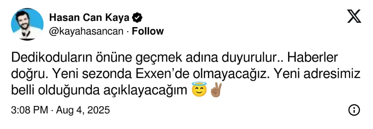 Son günlerde ise Hasan Can Kaya’nın farklı dijital platformlardan teklifler aldığı ve yeni sezon için henüz hiçbir platformla resmi anlaşma yapmadığı iddiaları gündeme gelmişti. Ünlü komedyen, bu söylentilere yanıt vermek üzere X hesabından yaptığı açıklamada, “Yeni sezonda EXXEN’de olmayacağız” diyerek ayrılık iddialarını doğruladı. Yeni projeleri ve adresleri hakkında henüz net bir bilgi olmadığını belirten Kaya, gelişmeleri takipçileriyle paylaşacağını söyledi.