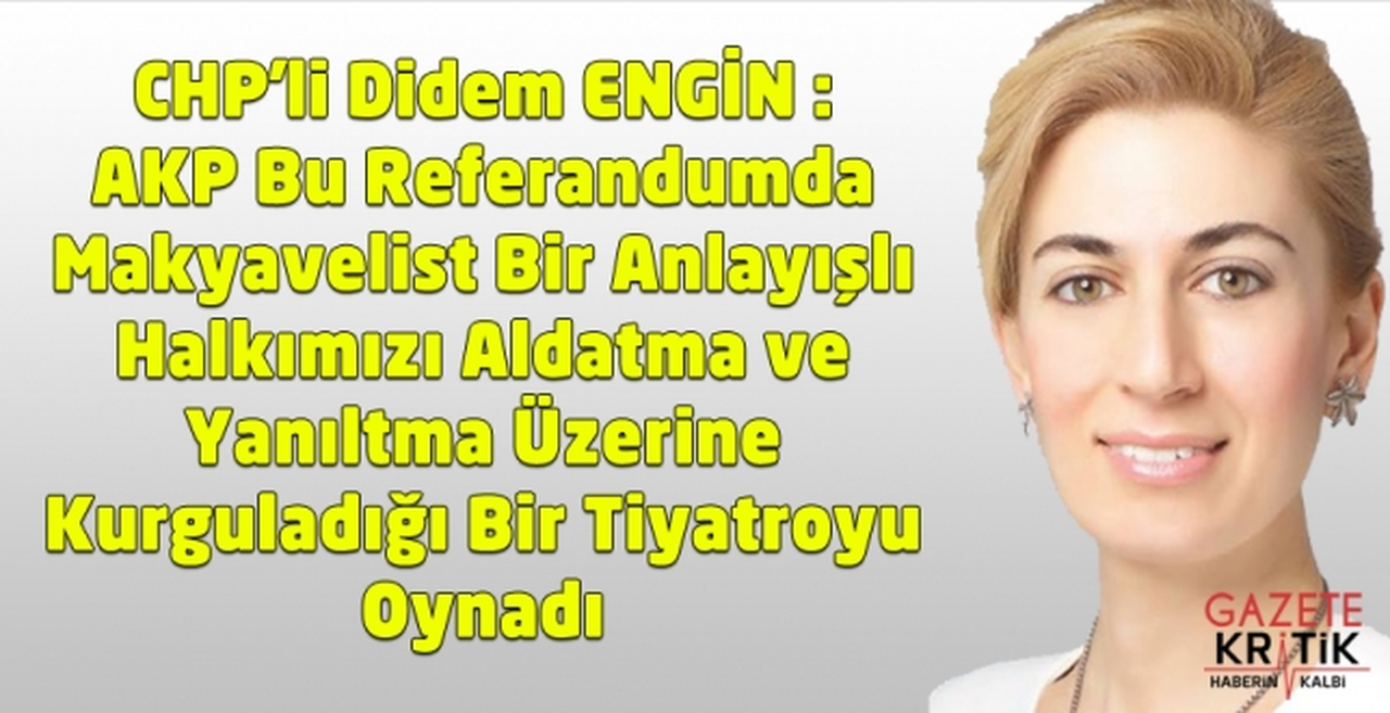 Konuşmasına Mevlana'nın “Ya olduğun gibi görün, Ya da göründüğün gibi ol” sözleri ile başlayan Didem ENGİN, "Bu referandumda Adalet ve Kalkınma Partisi olarak, olduğunuz ya da göründüğünüz gibi değil, gerçekleri tamamen gizleyerek, halkımızı aldatma ve yanıltma üzerine Makyavelist bir anlayışla kurguladığınız bir tiyatroyu oynadınız. Bir taraftan kuvvetler birliğini hedefleyerek, yargının siyasileşmesi için teklif hazırladınız, diğer taraftan “Yargı Bağımsızlığı için Evet” pankartları astınız. Bir taraftan Meclis’in yetkilerini sınırlandıran, milletvekillerinin sözlü soru sorma imkânını bile kaldıran ve ülkemizdeki tüm yetkileri bir tek kişide toplayan maddeleri hazırladınız, diğer taraftan “Güçlü Meclis için Evet” pankartları ile her yeri donattınız" dedi.
