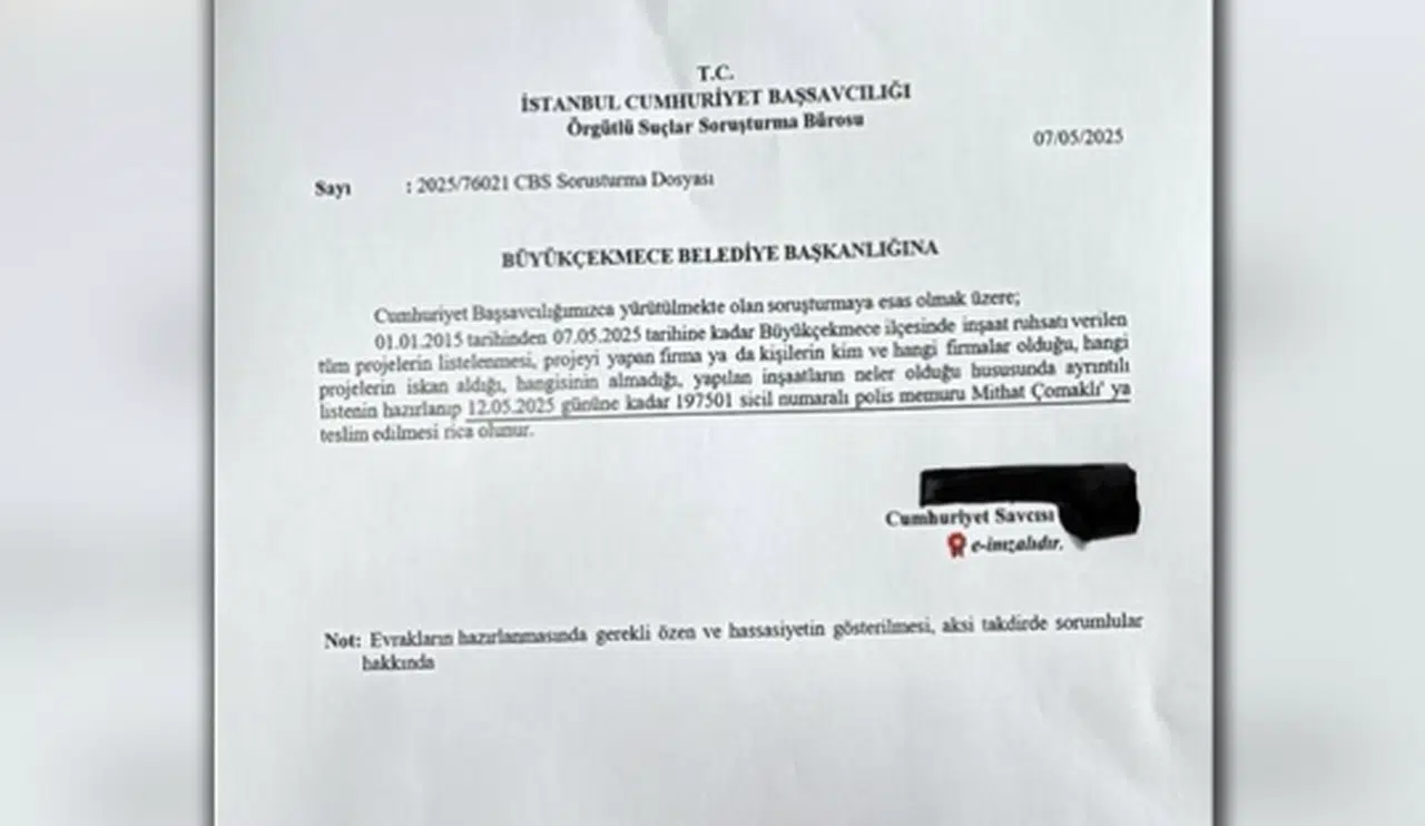 Tezcan'ın hesabından paylaştığı İstanbul Cumhuriyet Başsavcılığı'nın talep yazısına göre, İstanbul Cumhuriyet Başsavcılığı Büyükçekmece Belediyesi’nden son on yıllık inşaat projelerinin sahiplerinin listesini istedi. Dün Büyükçekmece Belediye Başkanlığı'na gönderilen yazıda, 1 Ocak 2015 ile 7 Mayıs 2025 tarihleri arasında belediye sınırları içerisindeki inşaat ruhsatı verilen tüm projelerin listelenmesi, projeyi yapan firma ya da kişilerin kim ve hangi firmalar olduğu, hangi projelerin iskan aldığı, hangisinin almadığı, yapılan inşaatların neler olduğu konularında ayrıntılı listesi talep edildi.