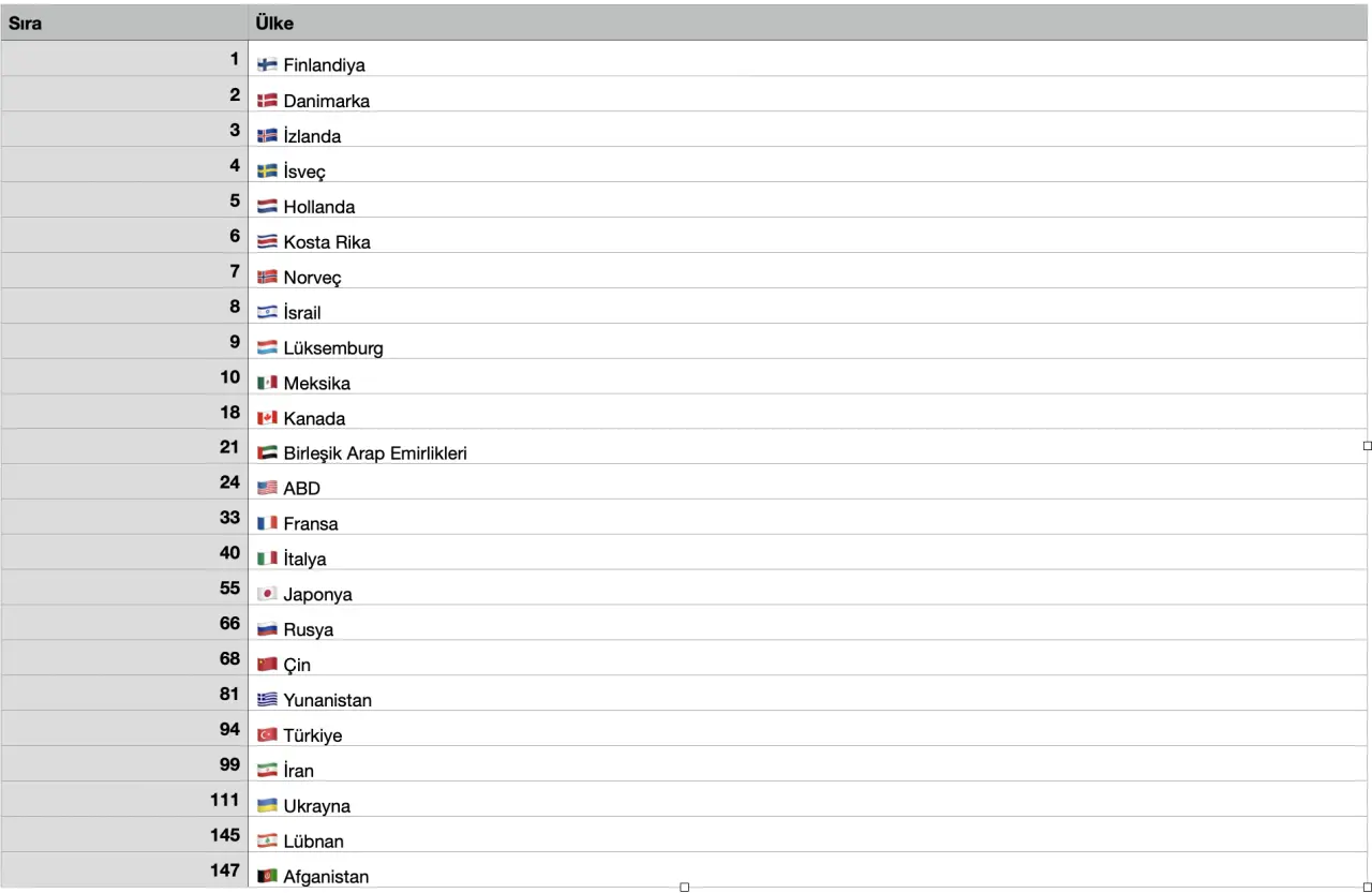 “2025 Dünya Mutluluk Raporu’na göre Türkiye, 147 ülke arasında 94. sırada. Yani biz, dünyanın en mutsuz ülkelerinden biriyiz. Peki birinci sırada kim var? Finlandiya. Yedi yıldır üst üste zirvede. Şimdi soralım kendimize: Onlar neyi farklı yapıyor? Biz nerede takılıp kalıyoruz?