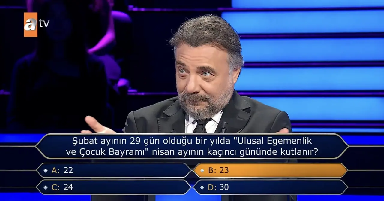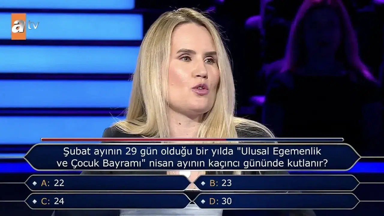 Soruda, “Şubat ayının 29 gün olduğu bir yılda Ulusal Egemenlik ve Çocuk Bayramı, Nisan ayının kaçıncı gününde kutlanır?” şeklinde kafa karıştıran bir ifade yer aldı. Yarışmacı, şubat ayının 29 gün olmasıyla tarihi ilişkilendirmekte zorlanınca seyirciden yardım istedi. Seyircinin %93’ü doğru cevap olan “23 Nisan”ı işaret etti ve yarışmacı da bu cevabı kabul etti.