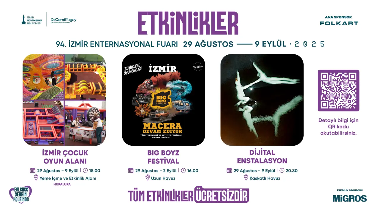 İzmir Büyükşehir Belediyesi’nin farklı birimlerinin katkılarıyla renkli etkinlikler de Gençlik ve Spor Alanı’nda ziyaretçilerle buluşacak. Meslek Fabrikası, seramik ve barista atölyeleri ile mobil istihdam otobüsünü alana taşıyacak. Kültür ve Sosyal İşler Dairesi baskı, mozaik ve vitray atölyeleri ile katılım sağlayacak. ESHOT ise “Geçmişten Günümüze ESHOT” sergisi ve nostaljik mavi otobüs sergisi ile ziyaretçilere ulaşacak. Eşrefpaşa Hastanesi, kuracağı sahra çadırı ile alanda yer alacak. Engelli Çalışmaları Birimi, sokak farkındalığı etkinlikleri, Boccia sporu, kutu oyunları, destekli istihdam programı ve tekerlekli sandalye bakımı uygulamaları ile farkındalık yaratacak. Gençlik Çalışmaları Birimi ise çanta boyama, origami ve karaokenin yanı sıra yapay zeka oyun ve avatar atölyeleri, Genç İzmir Pop Orkestrası akustik performansı, iyilik duvarı, kil deneyim atölyesi, festival makyajı, balon patlatma yarışması, Erasmus+ deneyim aktarım oyunu, hafıza yarışması, GO ve XOX oyunları, tütsü ve resim deneyim atölyeleri, Japon kültürünü tanıtan yukata deneyimi ve extreme dart etkinlikleri ile fuar katılımcılarına oldukça geniş bir yelpazede deneyim yaşatacak. Kadın Çalışmaları Birimi de taş grafitisi atölyesi, dünya kahvesi atölyesi, şiddetsizlik atölyesi, kadınların İzmir haritası atölyesi, güçlenme durağı atölyeleri, bez çanta boyama atölyesi, eşitlik tüneli ve empati atölyesi ile farkındalık yaratacak. Spor Dairesi Başkanlığı da modern dans atölyesinin yanı sıra fuar boyunca yoga, tango, e-spor turnuvaları, çocuk jimnastik gösterileri ve ayak tenisi organizasyonlarıyla alana hareket katacak.