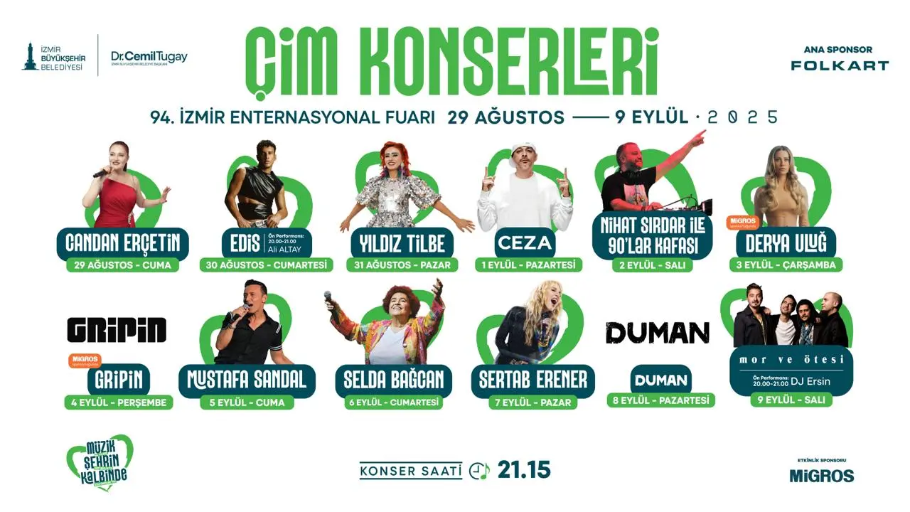 Fuar akşamlarının vazgeçilmezi Çim Konserleri, bu yıl da on binlerce müzikseveri Kültürpark’ta buluşturacak. 29 Ağustos’ta Candan Erçetin ile başlayacak konser serisi, 30 Ağustos’ta Edis ve ön performansta Ali Altay ile İzmirlilere Zafer Bayramı coşkusunu yaşatacak. 31 Ağustos’ta Yıldız Tilbe, 1 Eylül’de Ceza, 2 Eylül’de Nihat Sırdar ile 90’lar Kafası sahnede olacak. 3 Eylül’de Derya Uluğ, 4 Eylül’de de Gripin Migros sponsorluğunda Çim Konserleri’nde yer alacak. 5 Eylül’de Mustafa Sandal, 6 Eylül’de Selda Bağcan, 7 Eylül’de Sertab Erener, 8 Eylül’de Duman sahne alacak. Fuarın son günü 9 Eylül’de ise Mor ve Ötesi, İzmir’in kurtuluşunun 103. yılına yakışır bir final yapacak. Konserler saat 21.15’te başlayacak.