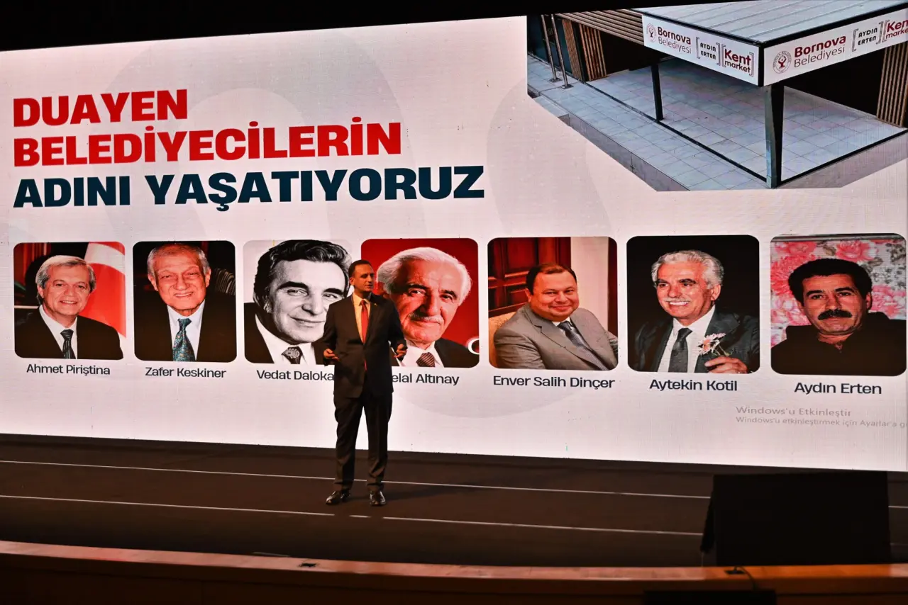 Bornova Belediye Başkanı Ömer Eşki, sahnede 66 dakika süren sunumuyla göreve geldiği günden bu yana yapılan çalışmaları anlattı. Eşki, belediyecilik anlayışlarını “Kuzey Yıldızı” mottosuyla tanımlarken, Bornova’nın geleceğini kentsel dönüşüm, yeşil dönüşüm ve dijitalleşme başlıkları üzerinden şekillendirdiklerini söyledi.
