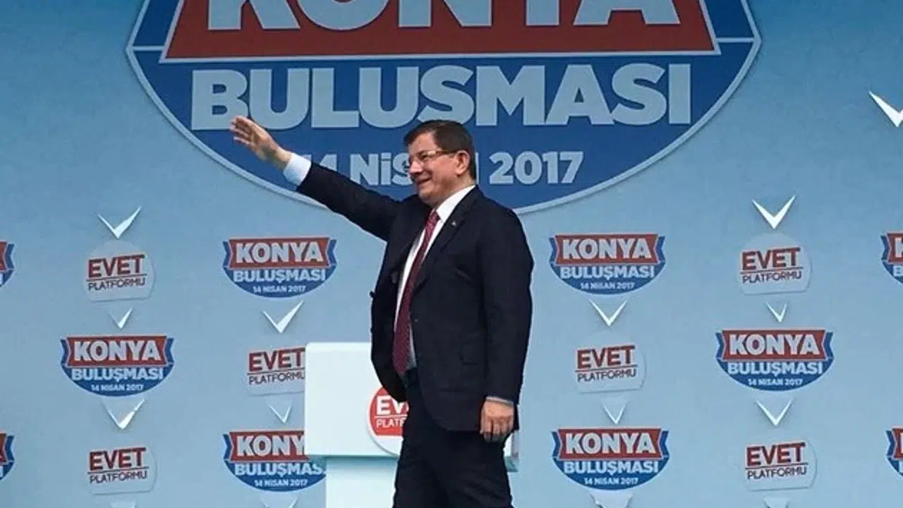 Eski Başbakan ve AKP Konya Milletvekili Ahmet Davutoğlu, Konya’da Cumhurbaşkanı Recep Tayyip Erdoğan’ın katılımıyla gerçekleştirilen mitingde konuştu. Erdoğan’ın konuşmasından önce sahneye çıkan Davutoğlu’nun konuşma önce mitingi düzenleyen kişilerin eline verdiği ‘Evet’ şapkasını eline alan Davutoğlu’nun şapkayı takmadan bırakması dikkat çekti. Davutoğlu’nun mitingde ‘evet’ çağrısında bulunmaması gözlerden kaçmadı.