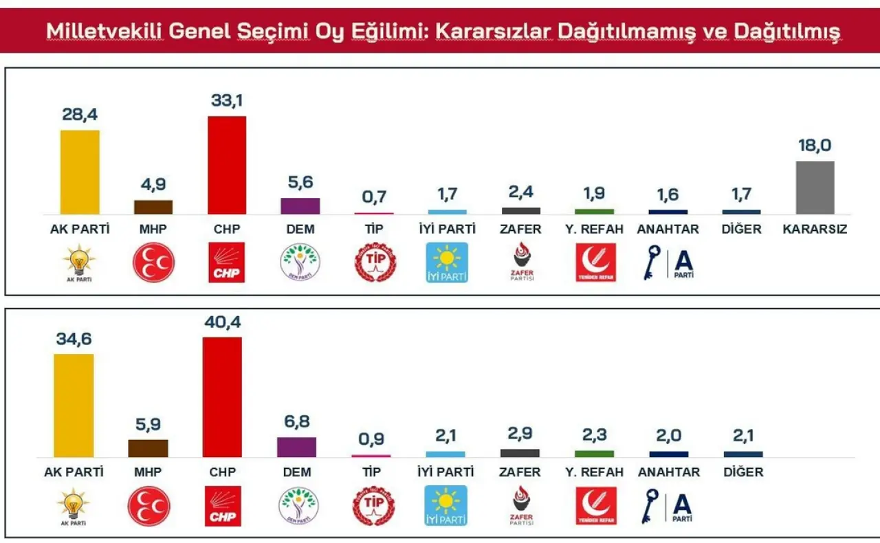 Çeşitli anket firmalarıyla çalışan CHP Genel Merkezi'ne sunulan bu son ankete göre; kararsızlar dağıtılmadan önce CHP yüzde 33,1 oy oranıyla birinci parti olurken, AK Parti'nin oy oranı yüzde 28,4. Kararsızlar dağıtıldığında ise CHP yüzde 40,4 oy oranıyla birinci parti olurken AK Parti'nin oy oranı yüzde 34,6 olarak ölçüldü.
