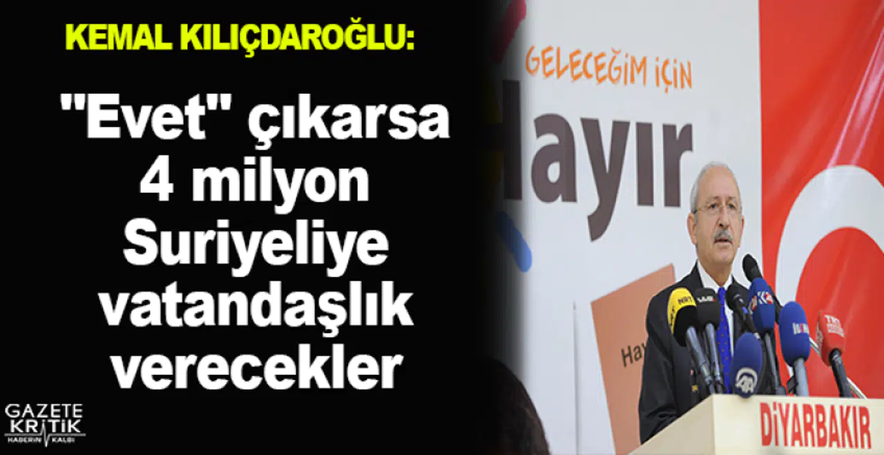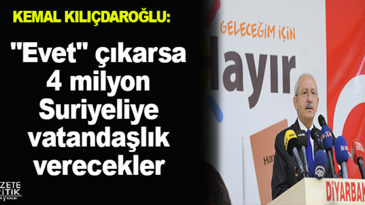CHP Genel Başkanı Kemal Kılıçdaroğlu, anayasa değişikliği kanununa ilişkin olarak, "Türkiye'nin yarısı icralık. Vatandaş borcunu ödeyemiyor. Bunun sebebi parlamenter sistem mi? 4 milyon Suriyelimiz var, kendi çocuklarımıza o kadar iş bulduk ki, eleman bulamıyoruz. Öyle bir hava var. 4 milyon Suriye parlamenter sistem yüzünden mi geldi? Şimdi 'Evet, çıksın, bunlara vatandaşlık vereceğiz' diyorlar" ifadesini kullandı.