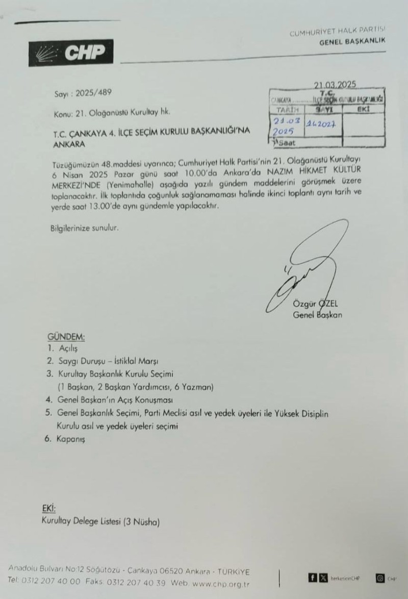 6 Nisan günü ben CHP Genel Başkanı olarak delegelerimizin 5 Kasım 2023'te verdikleri o yetkiye, bugüne kadar onları utandırmadan geldiğimiz bu süreçte onların yeniden yetkilendirmesine, onların CHP'nin iradesini tazelemelerine talibim. CHP Genel Başkanı olarak partiyi olağanüstü kurultaya götürüyorum. Bunu 23 Mart günü yapacağımız Cumhurbaşkanı ön seçimine engel olmaya çalışan kötücül akla 'Haydi işinize' diyerek yolumuza devam ediyoruz."