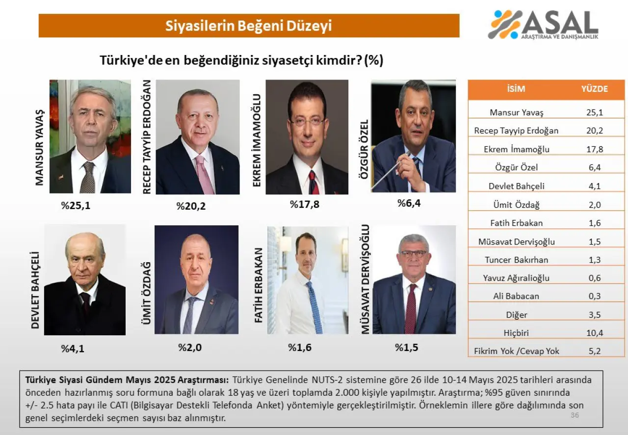 Asal Araştırma'nın yaptığı ankete göre Türkiye'de en çok beğenilen lider kimdir sorunun yanıtı olarak ilk sırada Ankara Büyükşehir Belediye Başkanı Mansur Yavaş yer aldı.
