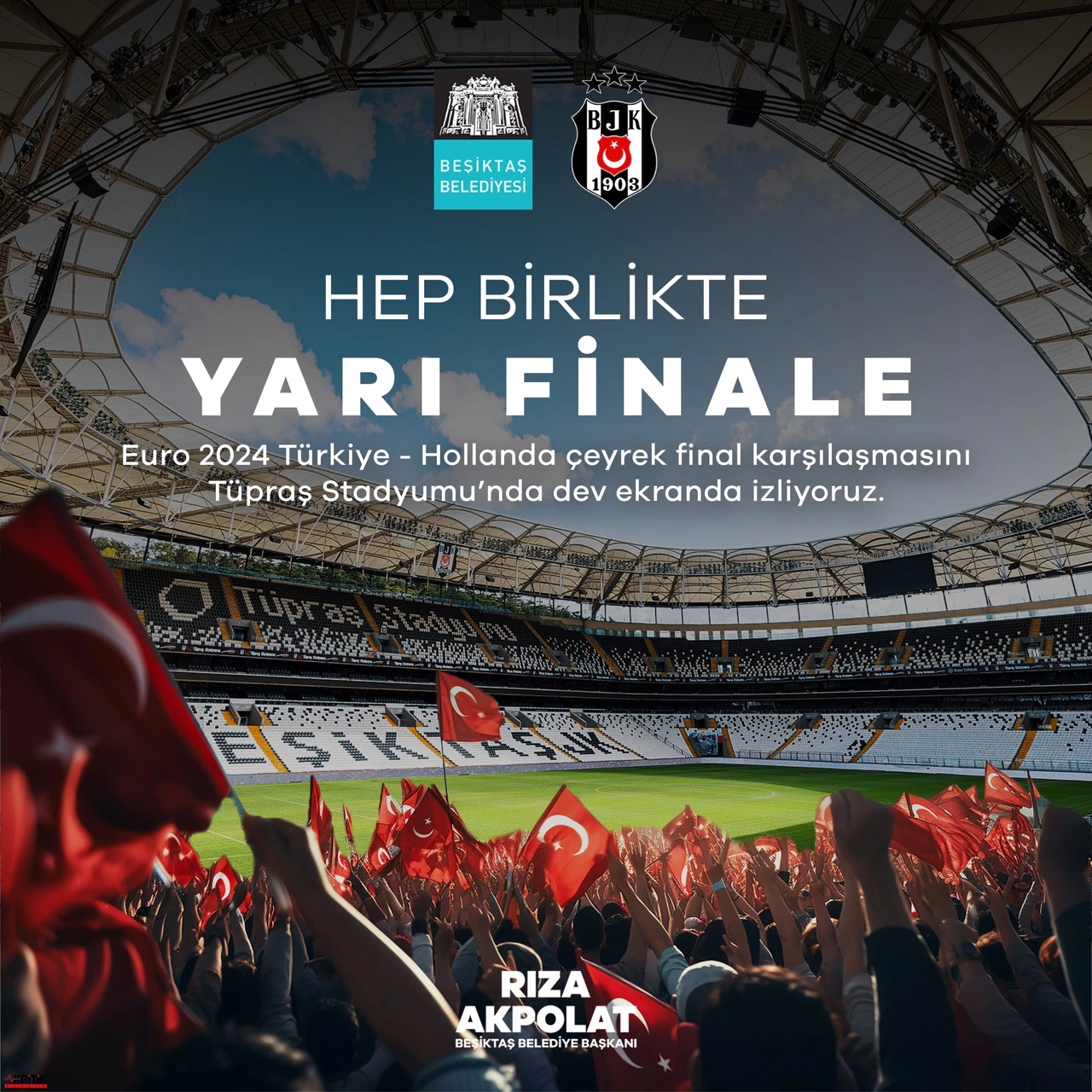 EURO 2024 Futbol Şampiyonası'nda çeyrek finale yükselen A Milli Takımımızın karşılaşması Beşiktaş Kulübü ve Beşiktaş Belediyesi iş birliğiyle Tüpraş Stadyumu’nda yayınlanacak. Beşiktaş Belediye Başkanı Rıza Akpolat da vatandaşlara çağrıda bulunarak; “Euro 2024 Şampiyonluğu yolunda milli coşkumuzu stadyuma taşıyoruz! "Bir oluruz yolunda!" dedik ve Beşiktaş Kulübü ile el ele verdik. Hollanda ile çeyrek final maçımızı Beşiktaş Tüpraş Stadyumu’nda birlikte izliyoruz! Haydi İstanbul, Beşiktaş’ta buluşalım.’’ dedi.