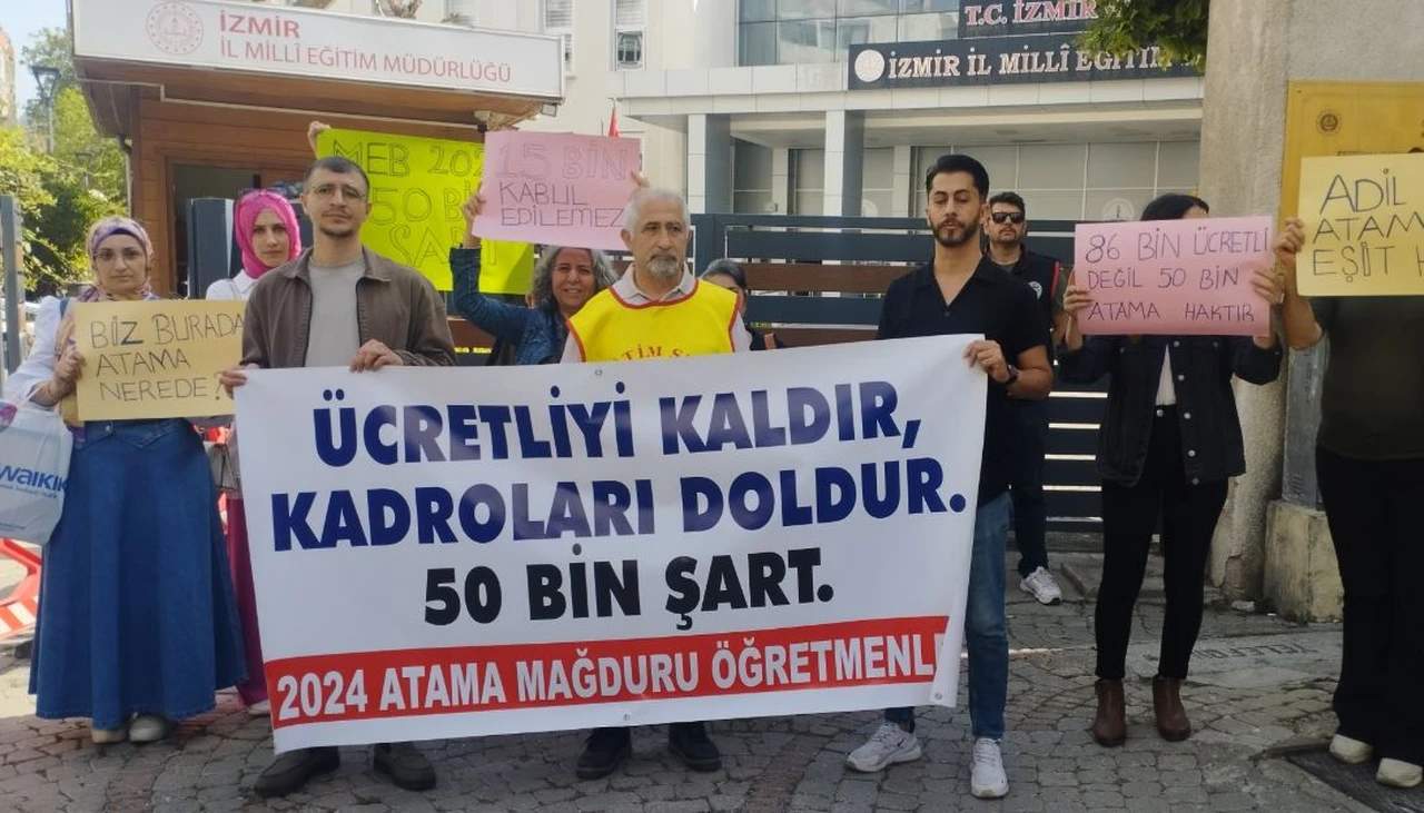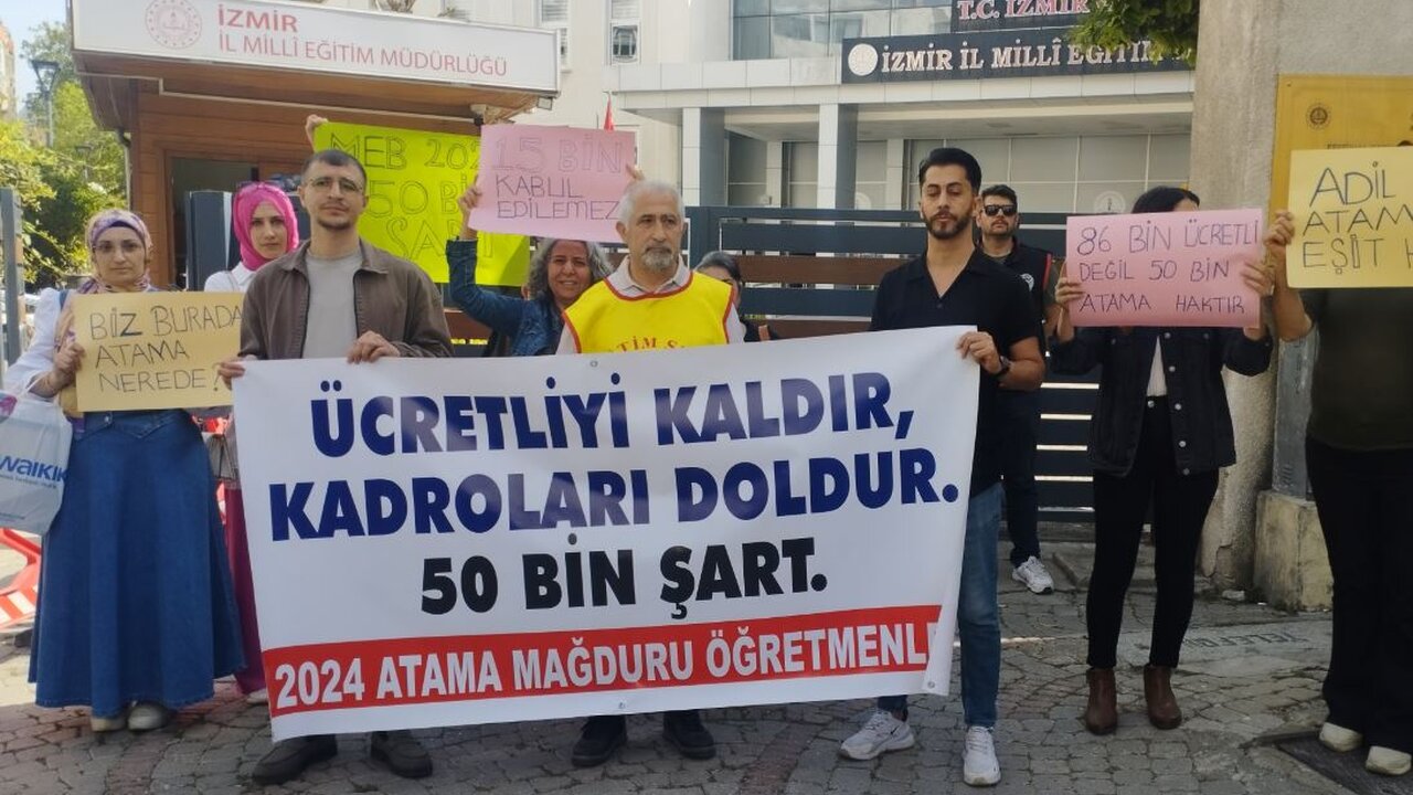 İzmir’de 2024 Atama Mağduru Öğretmenler, açıklanan 15 bin öğretmen ataması kararına tepki gösterdi. Atamaların az olmasının öğretmenleri ücretli öğretmenlik yapmaya zorladığını ifade eden 2024 atama mağduru öğretmenlerden Yağmur Sevim, ''2024 yılı içinde ek atamalarla en az 50 bin öğretmen daha atanmalıdır. Ücretli öğretmenlik uygulaması sona erdirilmelidir. Atamalar, yalnızca KPSS yazılı puan üstünlüğüne göre yapılmalıdı'' dedi.